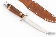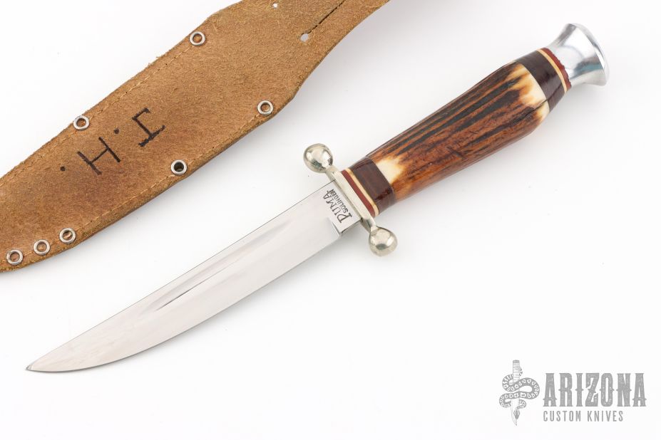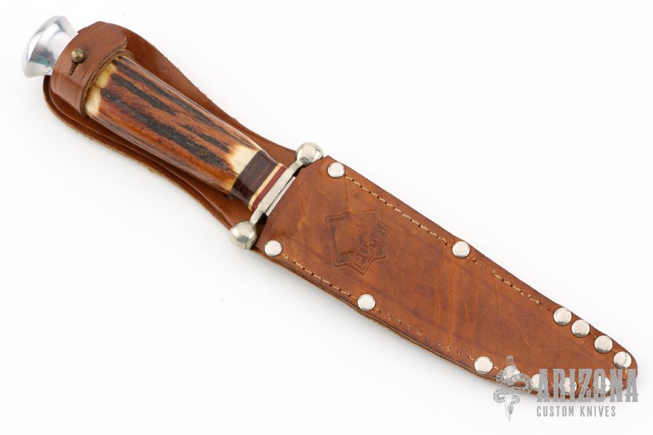 This hunter by Puma Knives features a polish finished blade with fullers, .155" blade stock and .740" blade depth, hidden tang construction. The handle has a nickel silver guard, stag grip, red/white/leather spacers, and an aluminum butt. Includes original leather sheath, has "J.H." and "D.3.G.M." on the back of the sheath. Has some scratches, otherwise excellent condition for its age.