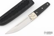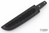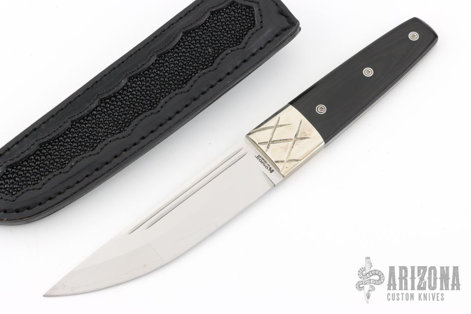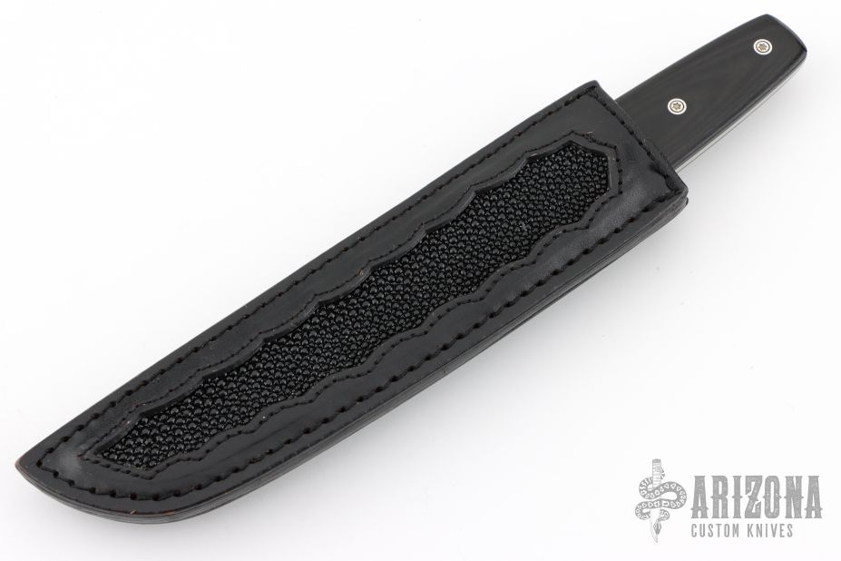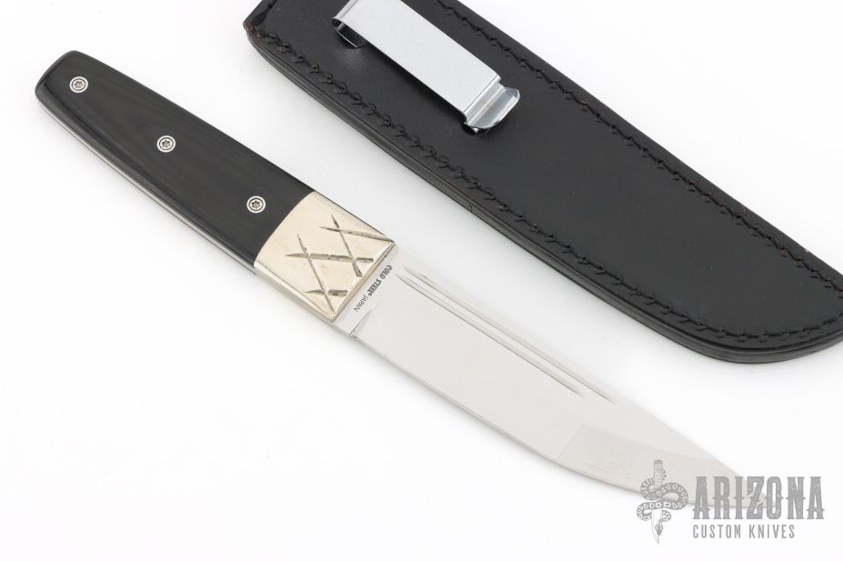 This Konjo II features a high polish "long sword point" VG-1 San Mai blade with false top edge, 1/8" blade stock, 1 1/8" blade depth. Full tapered tang construction with nickel silver dovetailed bolsters and polished black micarta handle. Includes black leather sheath with stingray skin inlay. Discontinued model. Has some scratches, has been resharpened, otherwise good condition.