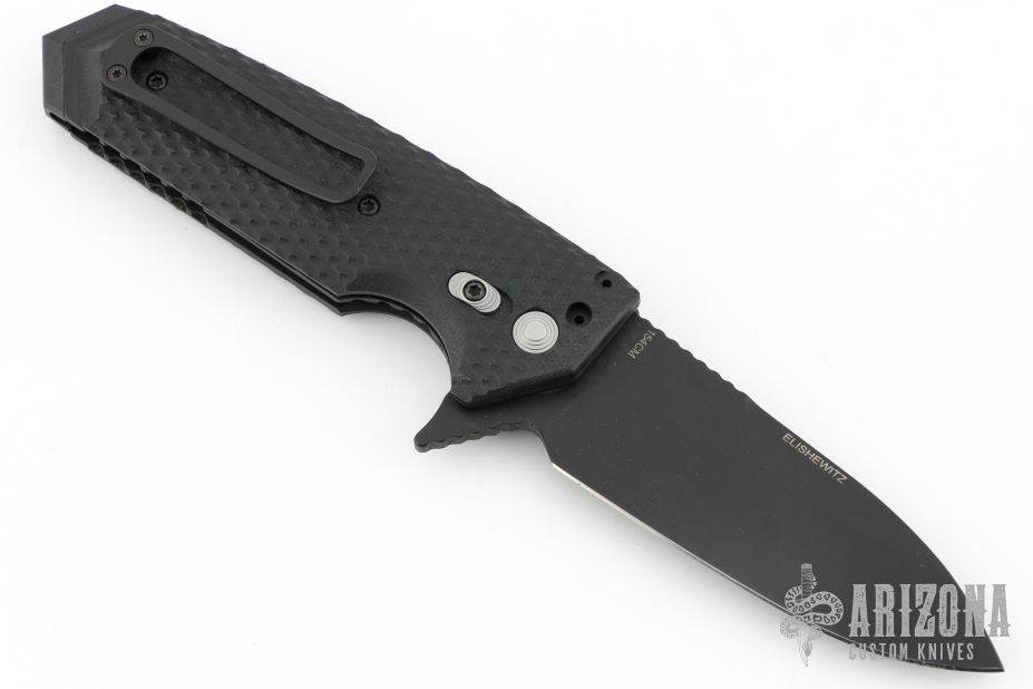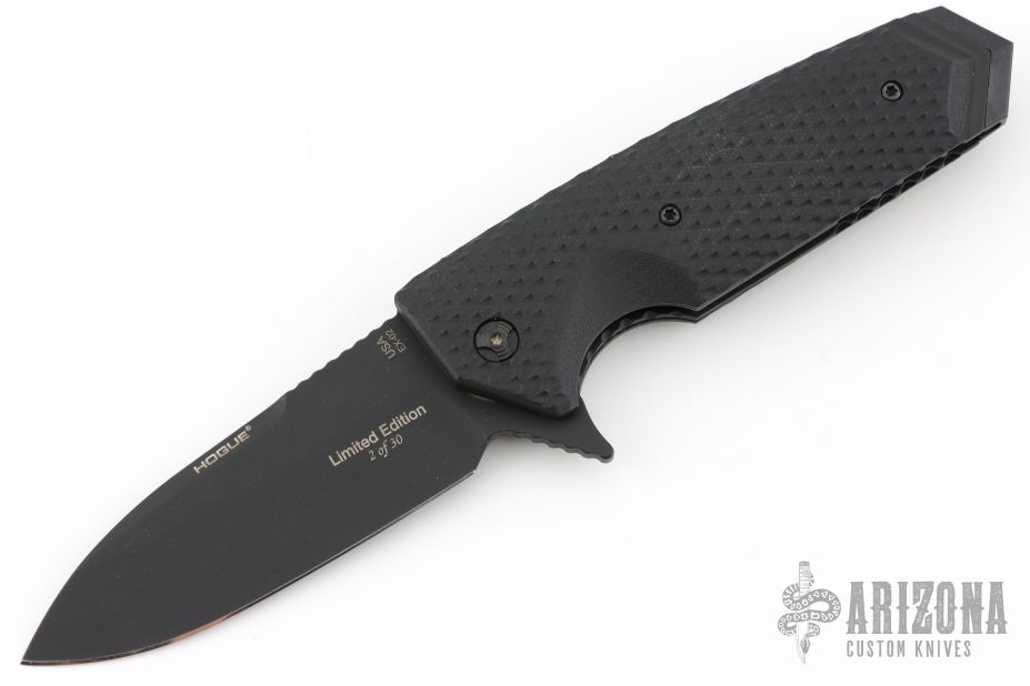 This Elishewitz design flipper by Hogue Knives features a black spearpoint blade. The handle has black checkered G-10 scales with safety. Has black stainless steel liners and pocket clip. Comes with original box, papers, and nylon sheath. Excellent condition.