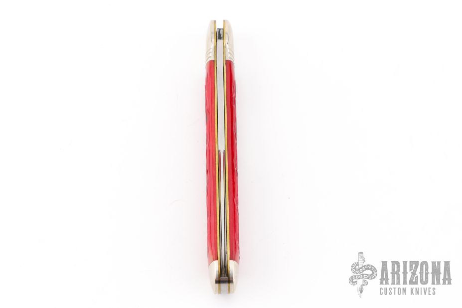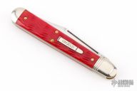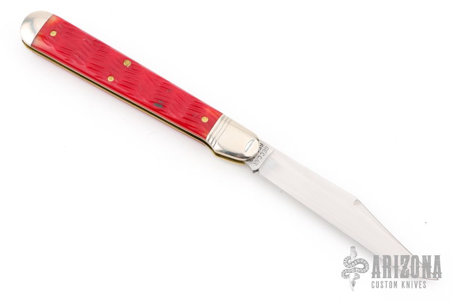 This knife by Great Eastern Cutlery features a polished finished blade with a single nail nick. The handle has nickel silver bolsters, escutcheon and brass liners, jig bone covers. Has half-stop. Comes with original tube, wax paper, and button. Has some light scratches, otherwise excellent condition.