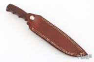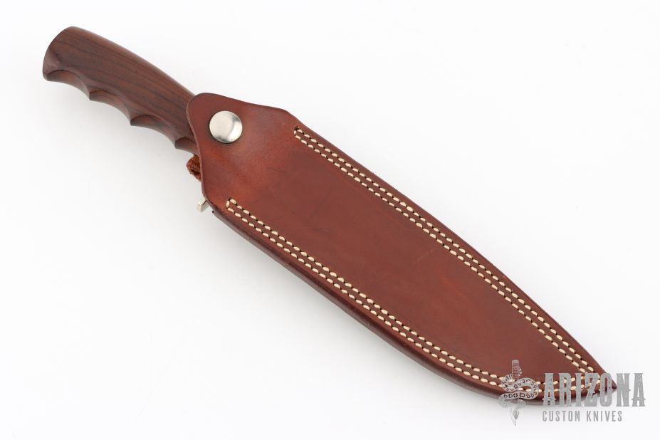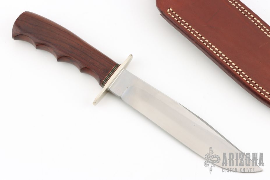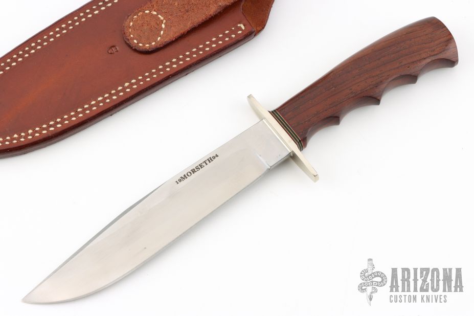 This Hunter's Bowie by Morseth Knives features a clip point laminated steel blade with .174" blade stock and 1.167" blade depth, hidden tang construction. The handle has a nickel silver guard, cocobolo grip, red/brass/black spacers. Comes with a brown leather sheath and a zippered case. Excellent condition. Made by Bob Dozier