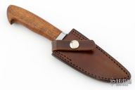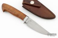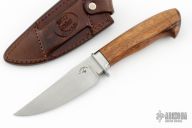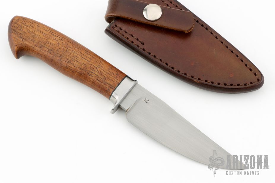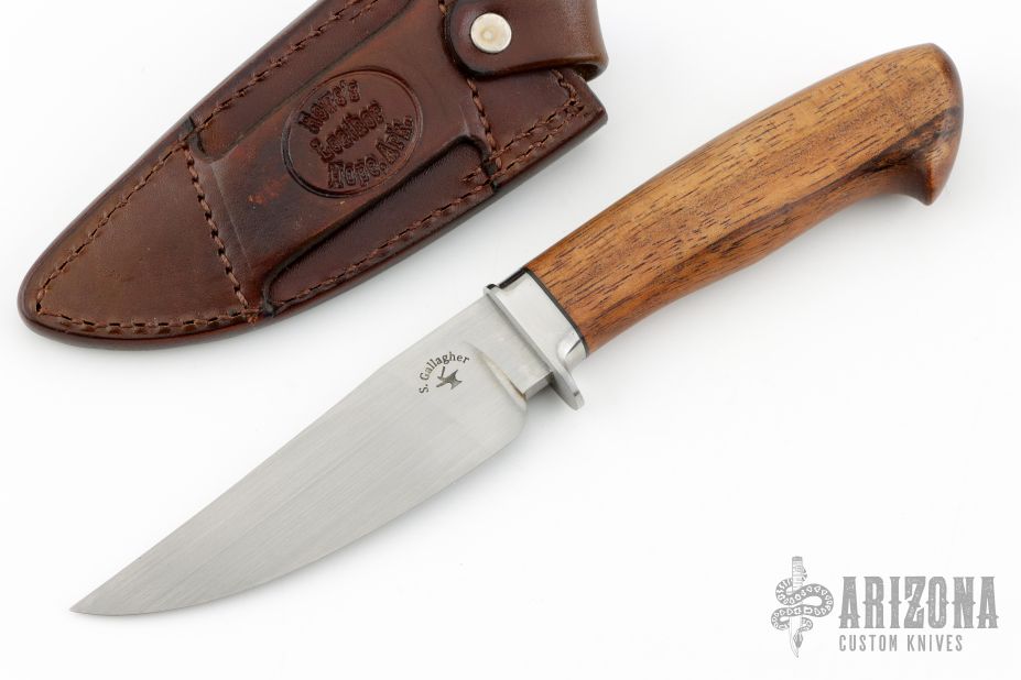 This hunter by Journeyman Smith Scott Gallagher features a hand rub satin finished blade with false top edge, .207" blade stock and 1.160" blade depth, hidden tang construction. The handle has a satin finished stainless steel guard, and Koa grip. Comes with a brown leather sheath made by Kenny Rowe. Excellent condition.