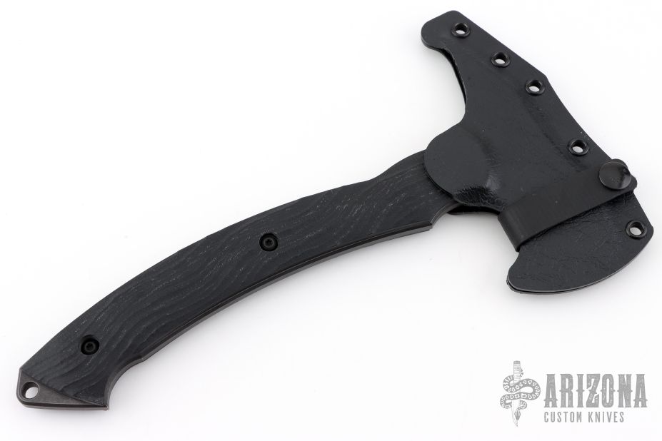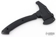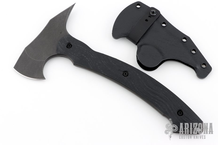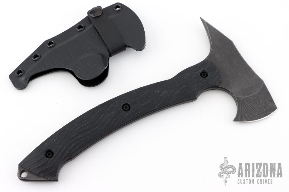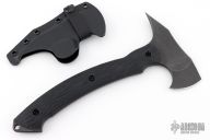 The Tomahawk by Toor features a black stonewashed blade and tang, .254" blade stock and 2" blade depth, full tang construction with black G-10 scales. Comes with original box, papers and kydex sheath. Excellent condition. #1068 on the blade.