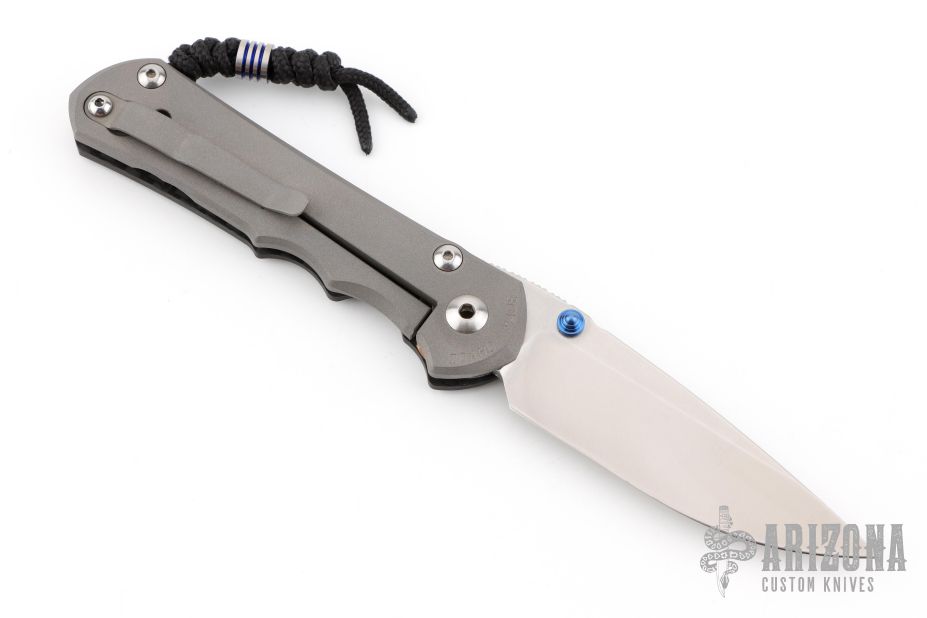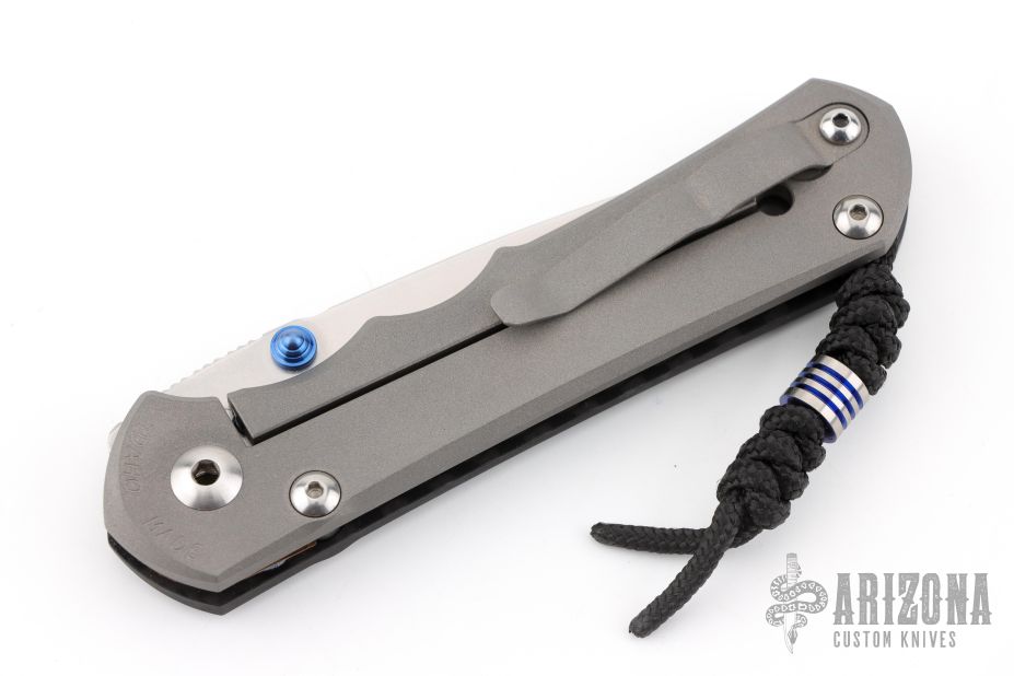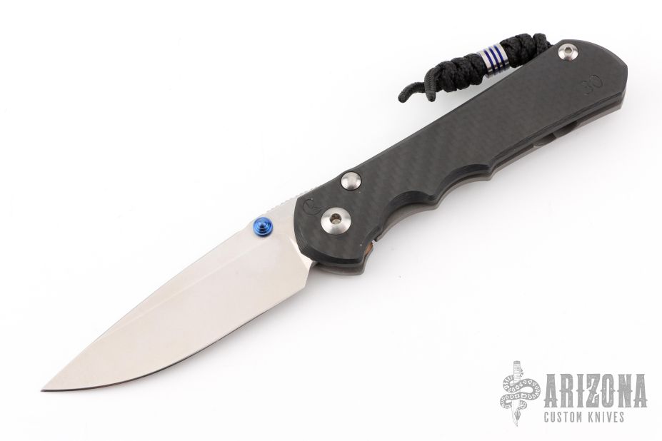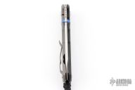 This Large Inkosi by Chris Reeve Knives features a tumble finished drop point blade with dual anodized thumbstuds and notched thumbrest. The handle is comprised of a carbon fiber and bead blasted titanium frame with a single barrel spacer, bead blasted titanium clip. Includes laynyard with a titanium bead. Includes original box, tools, microfiber cloth and paperwork dated Sept 30, 2016. Excellent condition. Marked "30" on the pommel of the scale, and matches the number on the box/card.
