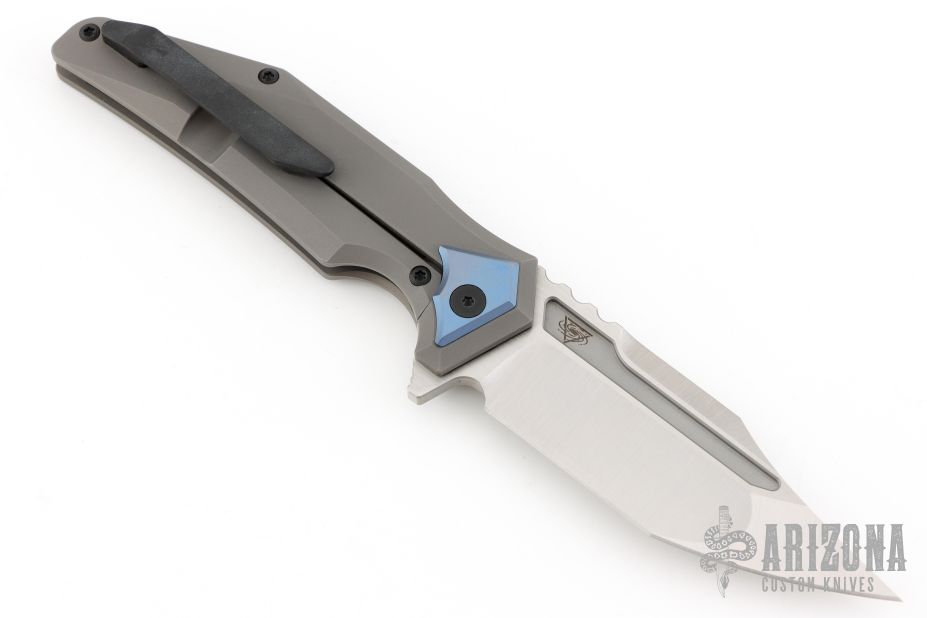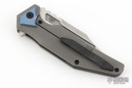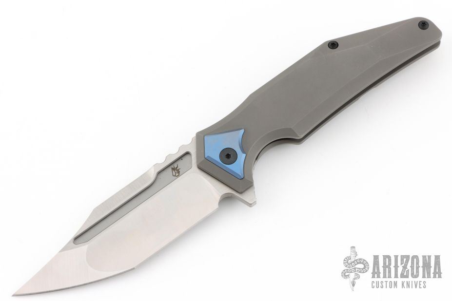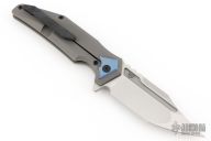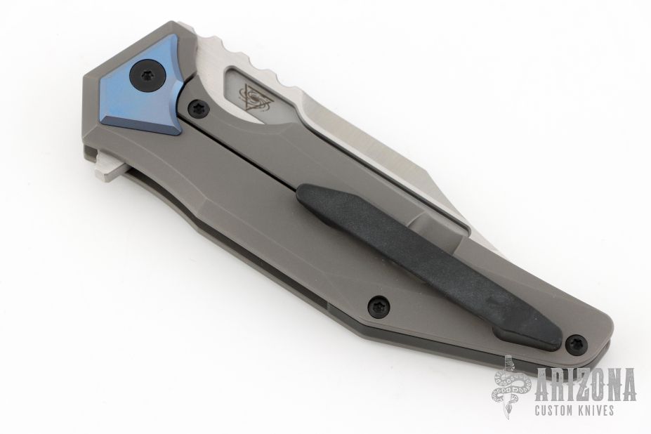 This Abyss by Arcane Design features a satin finished blade with notched thumbrest and flipper. The handle has a bead blasted titanium frame with blue aluminum pivot collars, black titanium backspacer and tip up clip with hidden screws. Comes with original zippered case, and COA. Has a couple light scuffs and scratches, great condition otherwise.