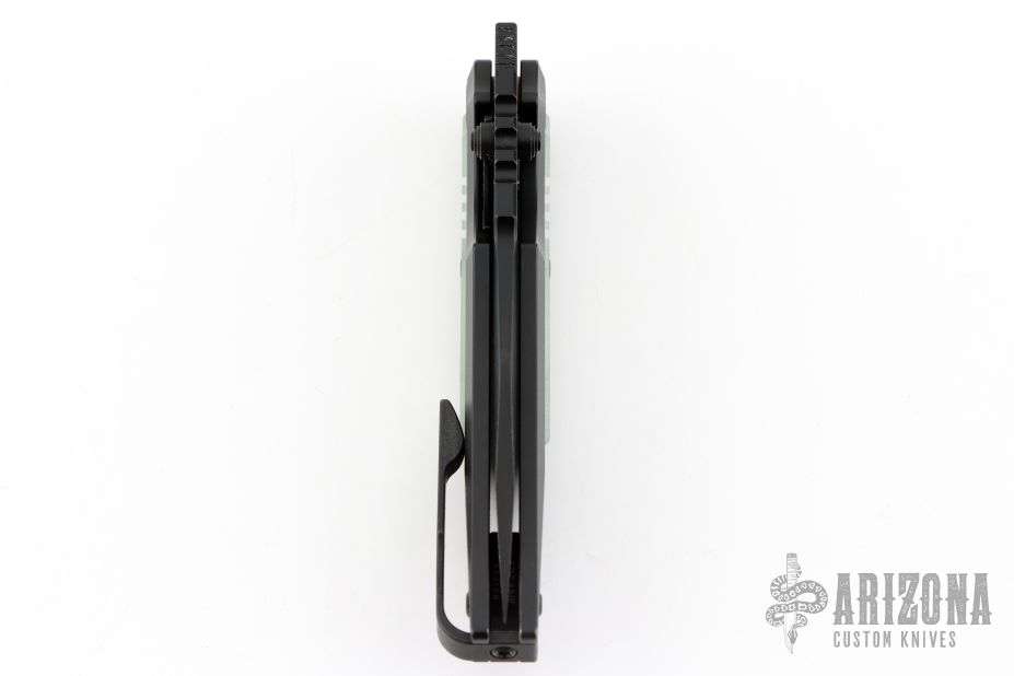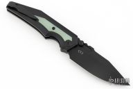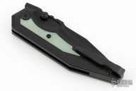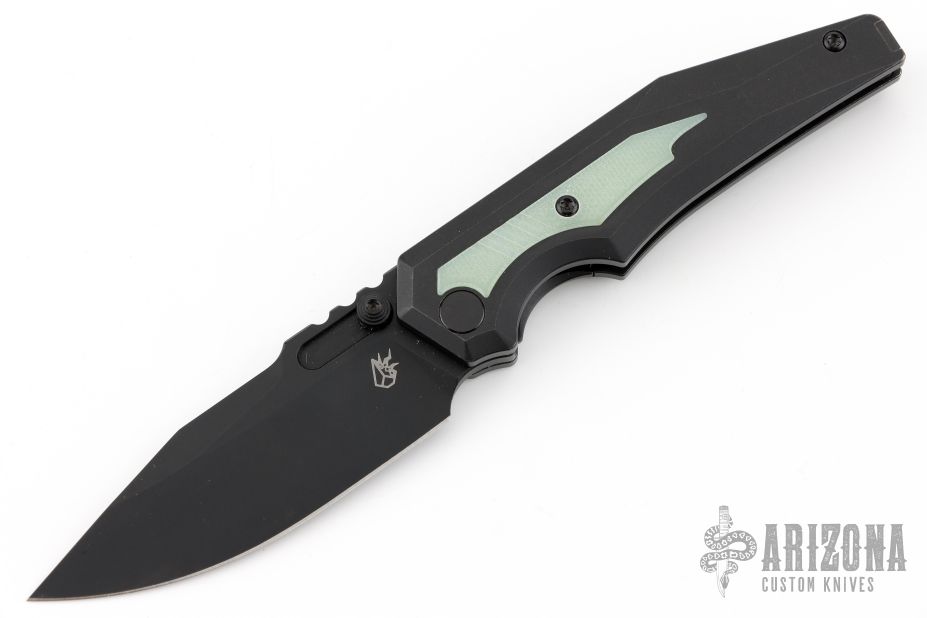 This Preytheon by Arcane Design has a black finished blade with notched thumbrest and dual thumbstuds. The handle has a black titanium frame with jade G10 inlays, tip up black titanium clip and backspacer. Comes with original zippered case and COA dated 12/1/22. Excellent condition.