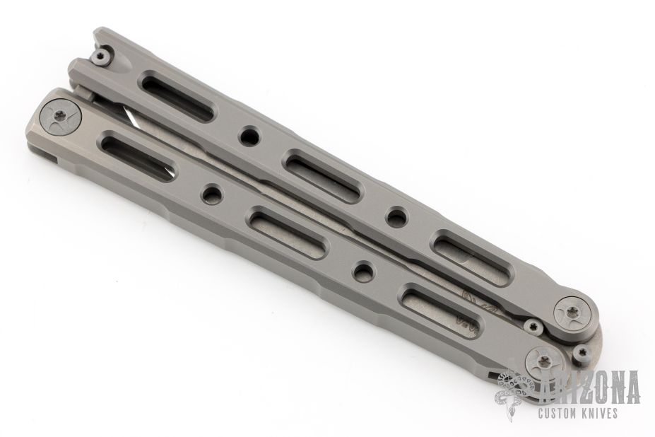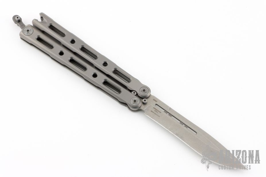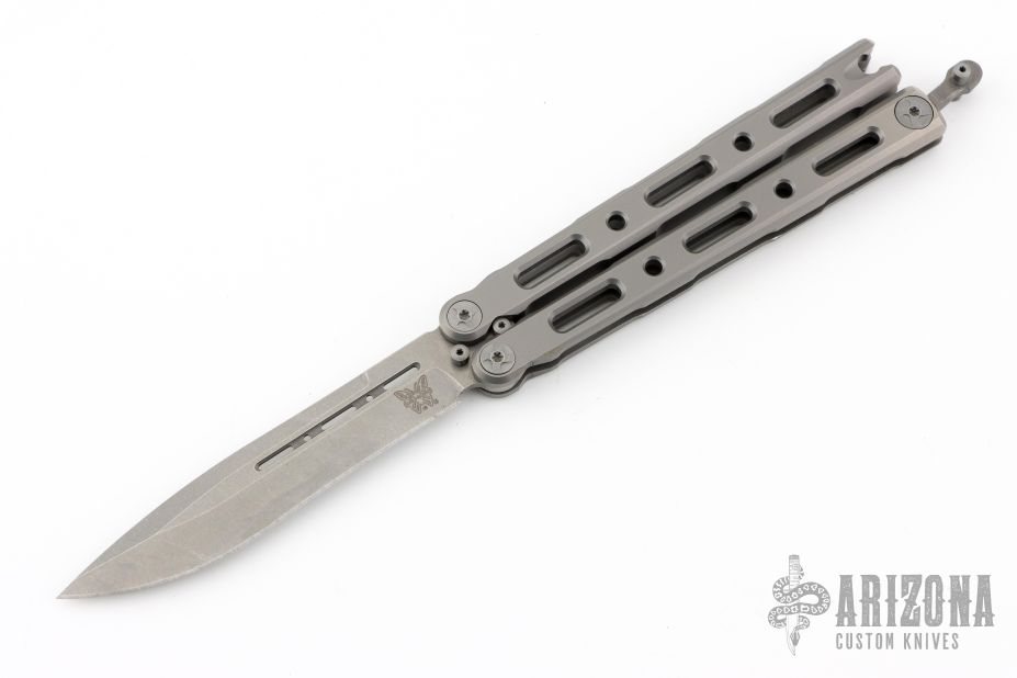 This Model 85 Balisong by Benchmade features a tumble finished blade. The handle has an integrally constructed, skeletonized titanium frame with bead blast finish. Spring-loaded T latch on pommel. Comes with original box, papers and slip sheath. Excellent condition.