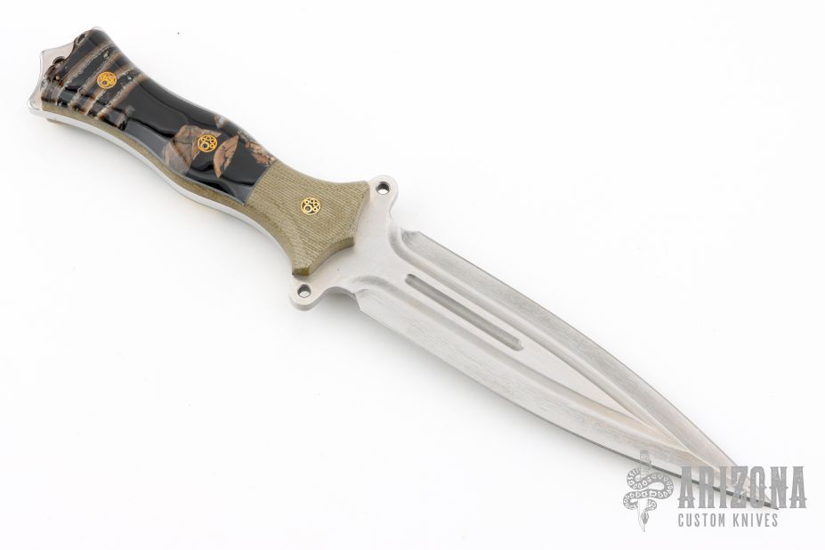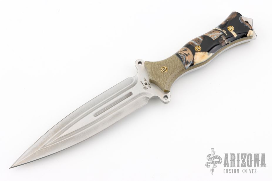 This Custom FMV6 by Busse Custom Shop features a satin finished double-edged blade with fullers, .207" blade stock and 1.350" blade depth, full tang construction. Has Nuclear Option. The handle has green canvas micarta bolsters with integral liners, mammoth tooth/ivory in black resin scales with gray liners and mosaic pins. Excellent condition.