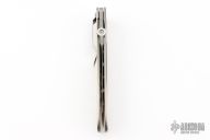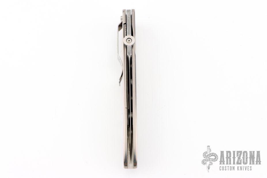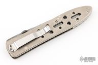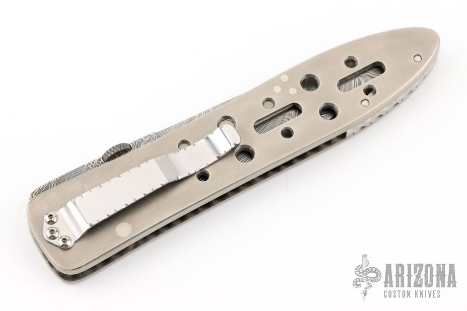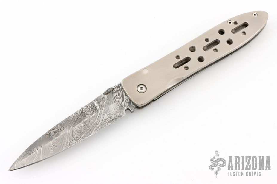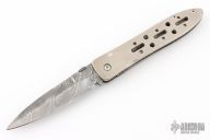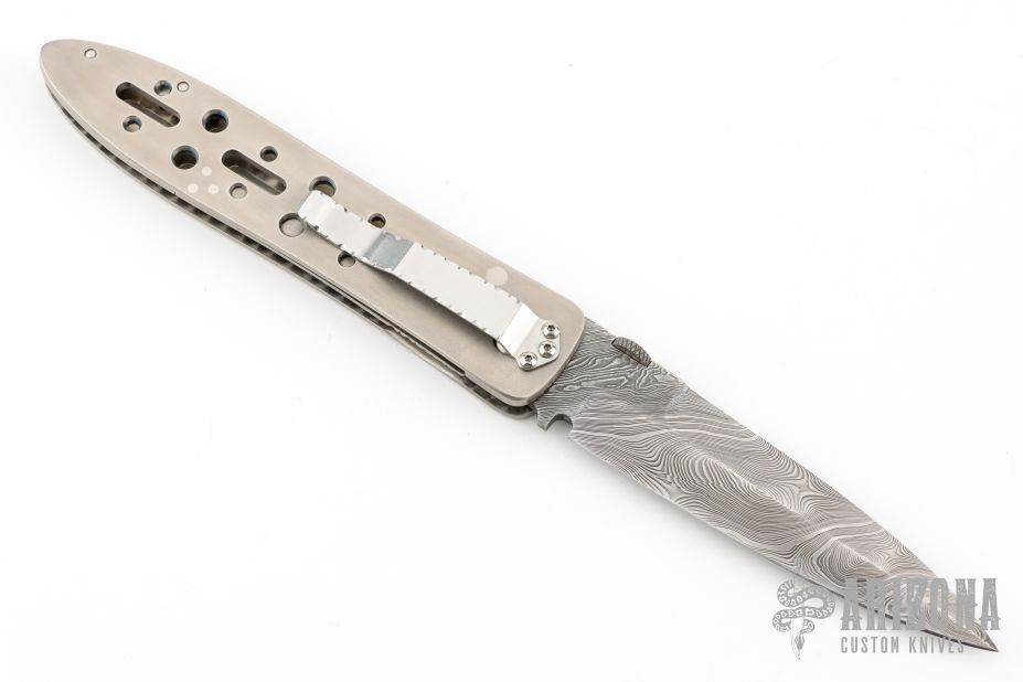 This linerlock folder by Crawford Knives features a Swedish Vinlin Stainless Damascus blade with a false top edge and a thumbdisc. The handle has a satin finished titanium frame with jeweled interiors, titanium liner and a fileworked stainless steel backspacer and tip down clip. Smooth action, nice blade seating and lockup. Excellent condition. Comes with a zippered case.