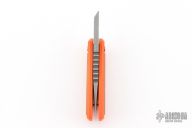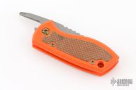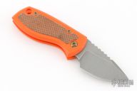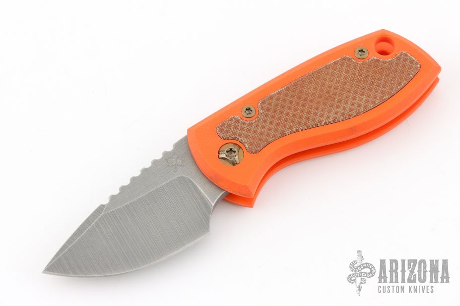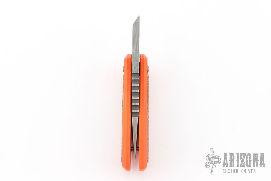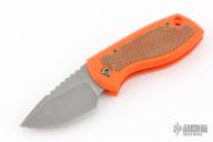 This Friction Folder by JW Knife & Tool features a satin finished blade with thumb rest. The handle has orange G10 scales, textured micarta inlays, titanium posts, and lanyard hole in pommel. Comes with COA and original box. Excelllent condition.