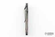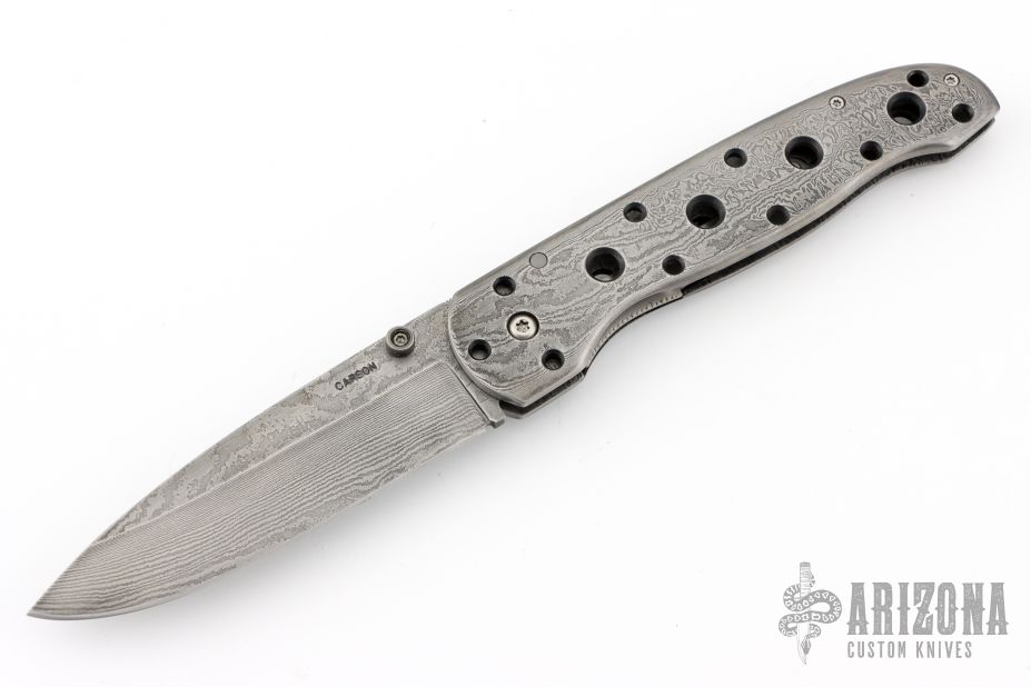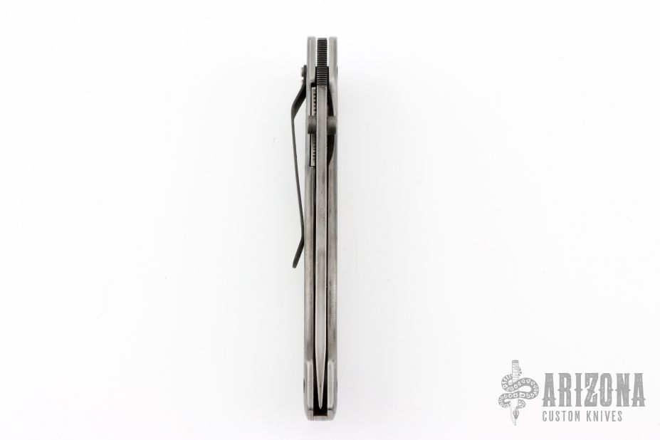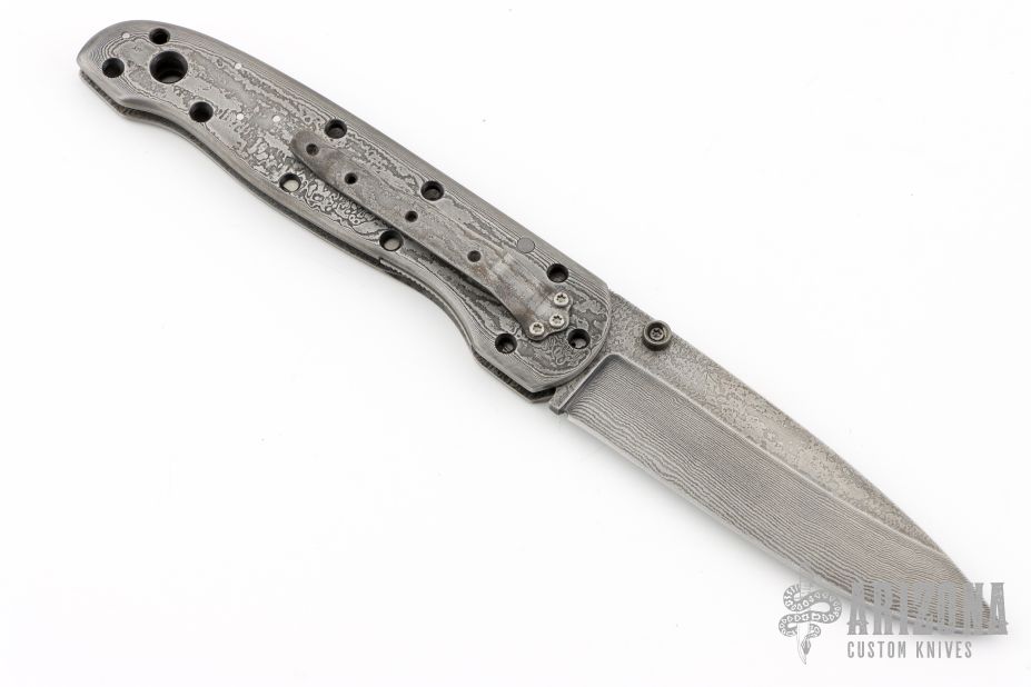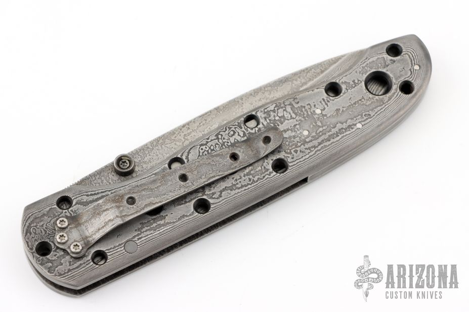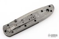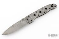 This model 16 linerlock folder by Kit Carson features a Damascus blade with dual thumbstuds and notched thumbrest. The handle has a Damascus frame, backspacer and tip down clip. Nice detent, lockup and blade seating. comes with a zippered case. Excellent condition. The consignor said he bought this knife from Kit at the 1999 Blade Show in Atlanta, GA.