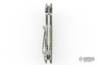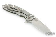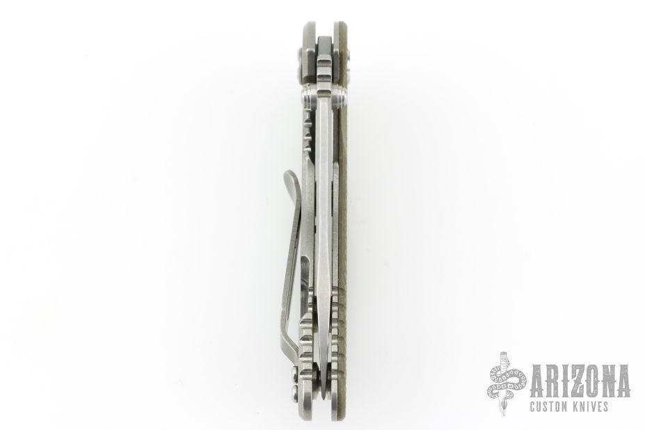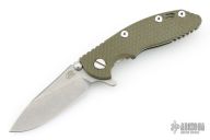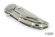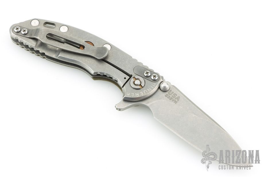 This XM-18 by Rick Hinderer features a stonewash finished slicer blade with notched thumbrest and flipper. The handle has a stonewash finished titanium frame, green G-10 scale, satin titanium barrel spacers, and a tip up or down reversible titanium clip and filler tab, lanyard hole at the butt. Comes with a Hinderer box, with no label. Has a couple light scuffs, excellent condition otherwise.