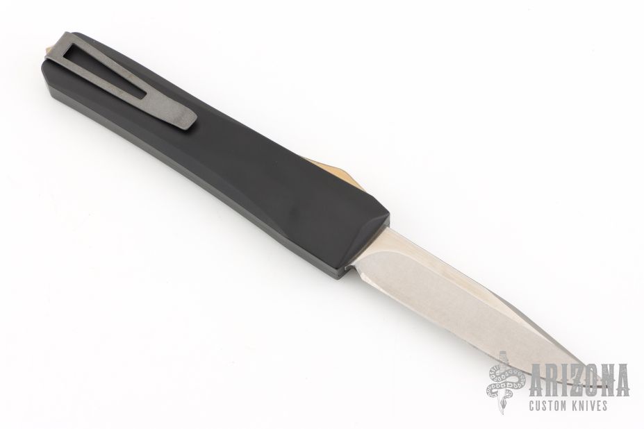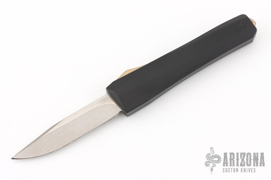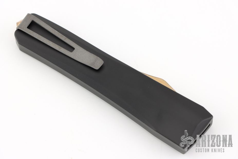 This OTF by Core Edge Knives features a two-tone stonewashed clip point blade.  The handle has a contoured black aluminum frame with no visible hardware and a bead blast finished tip down steel pocket clip.  Has some scuffs on the clip, otherwise excellent condition. Comes with original box.