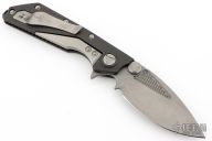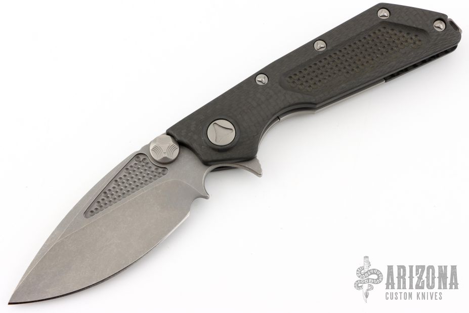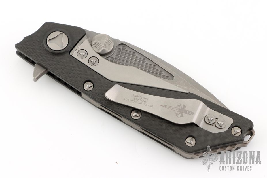 The Death on Contact flipper by Marfione Custom Knives features a hand ground Apocalyptic finished blade and a carbon fiber handle with blasted stainless steel clip and titanium lockbar. Marked "A. Marfione" and "Death On Contact" on clip. Dagger logo on clip. Excellent condition. Nice detent, lockup and blade seating. Dated 07/2015. Comes with original box, zippered case and COA.