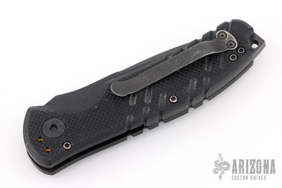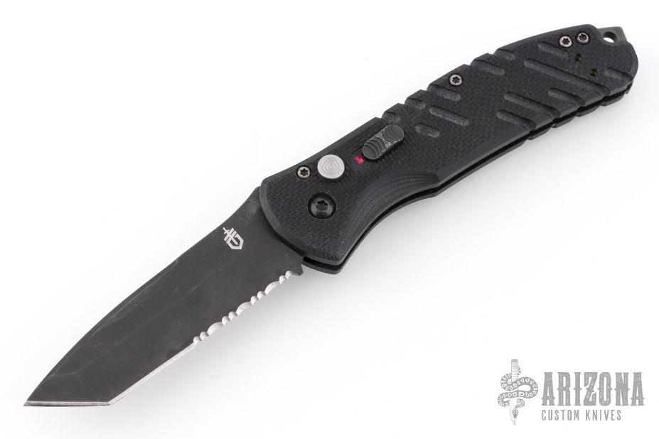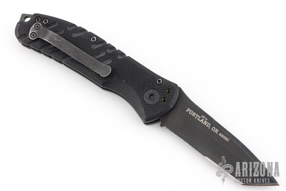 This Tanto by Gerber features a partially serrated black coated blade with push button and safety. The handle has milled black G-10 scales and a 3-way stainless steel clip. Has some scuffs and scratches, otherwise good condition.