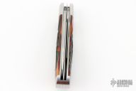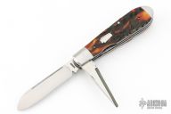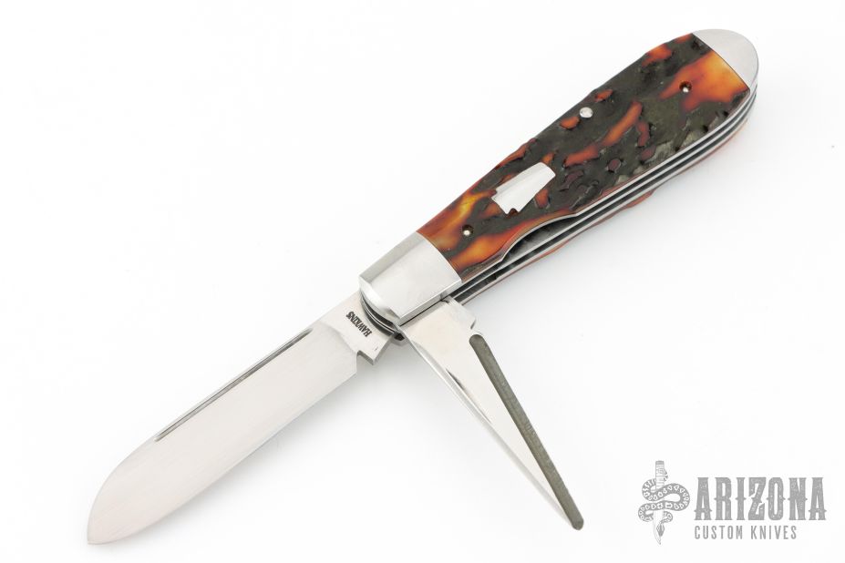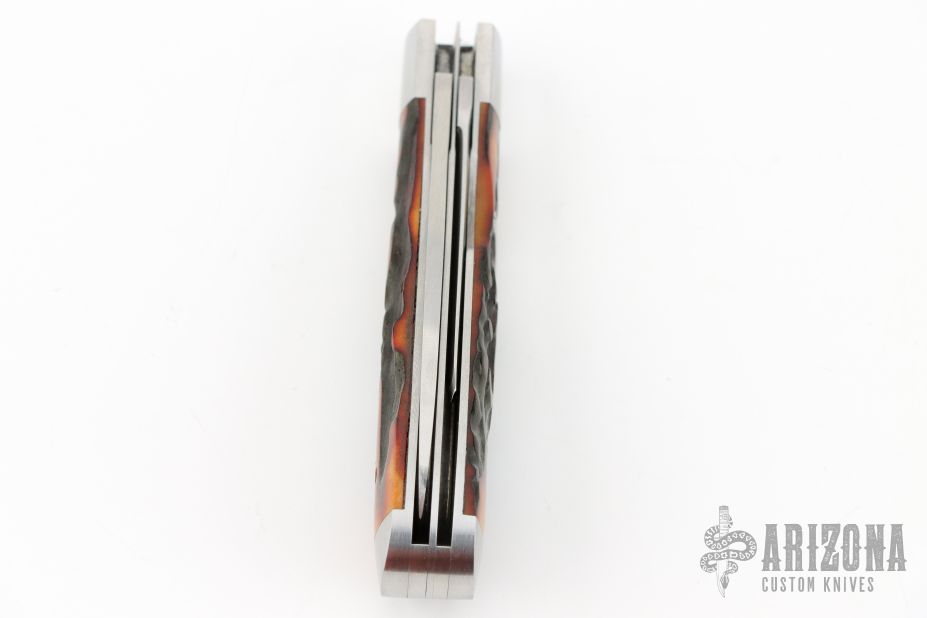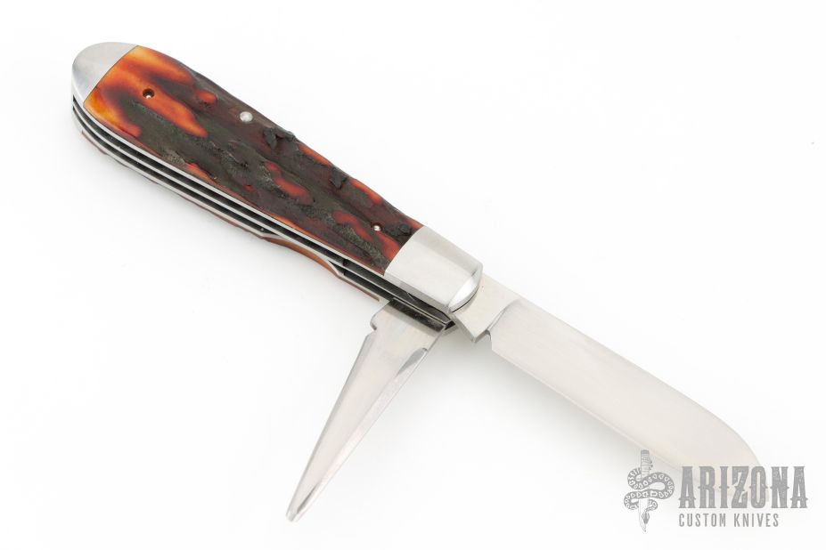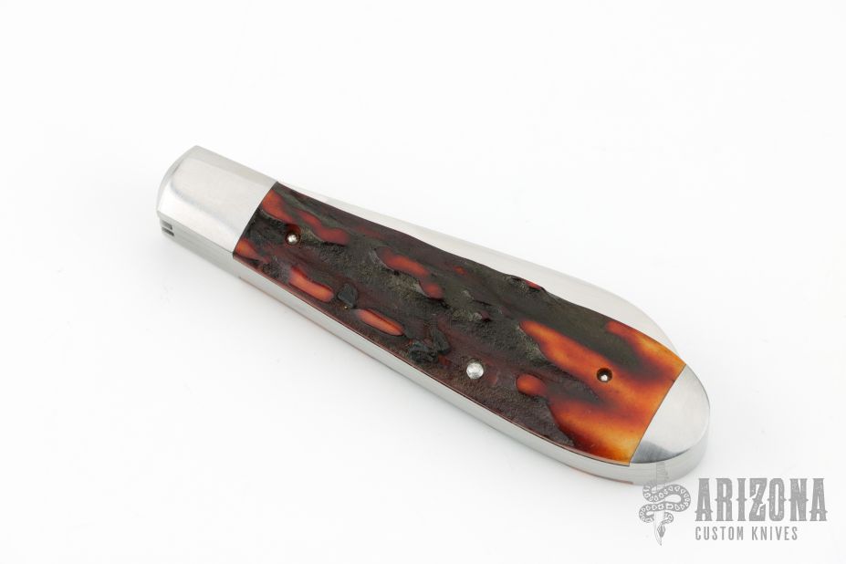 Thisknife  by Jeff Hawkins features hand rub satin finished blades with nail nick and long pull. The handle has stainless steel bolsters and liners, amber stag covers, stainless steel escutcheon and springs. Has half-stop, flush in all positions. Comes with in maker's zippered case. Excellent condition.