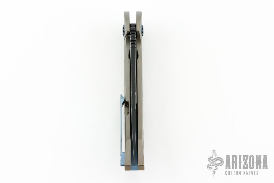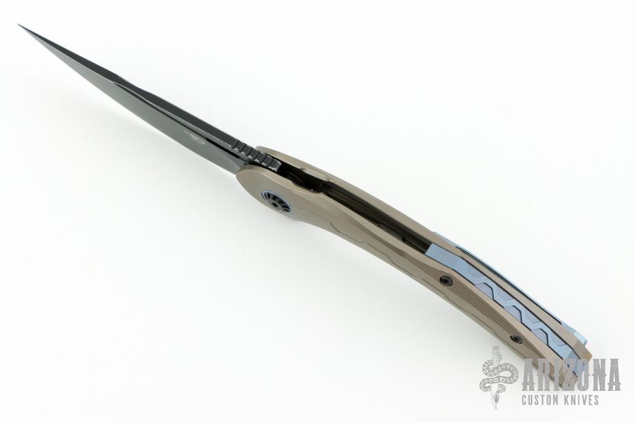 This Marukka Frame Lock Knife model has a gray titanium handle and a black M390 stainless steel.