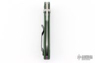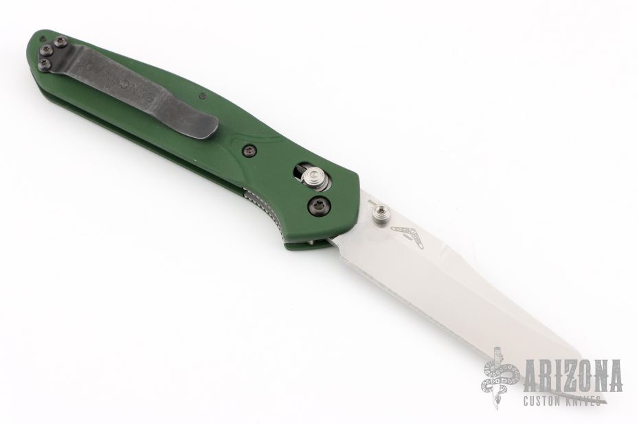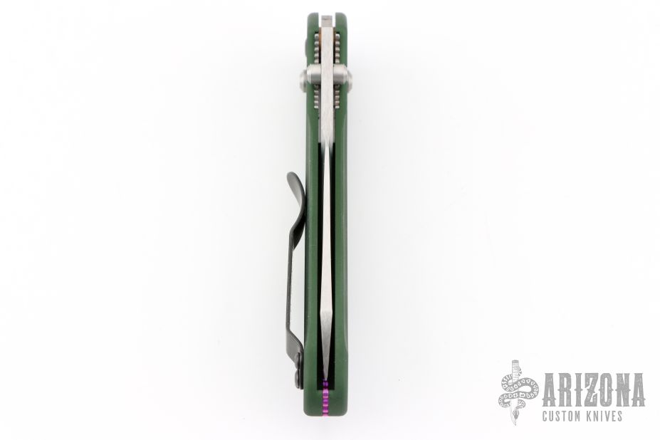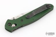 This Benchmade Osborne 940 features a tumble finished clip point blade with swedge and dual thumb studs. The handle is comprised of a machined and green anodized aluminum frame over jimped and purple anodized titanium backspacer. The black coated, steel tip up clip is reversible for right or left hand carry. Has a couple of spots on the blade otherwise excellent condition. Comes with original box and papers.