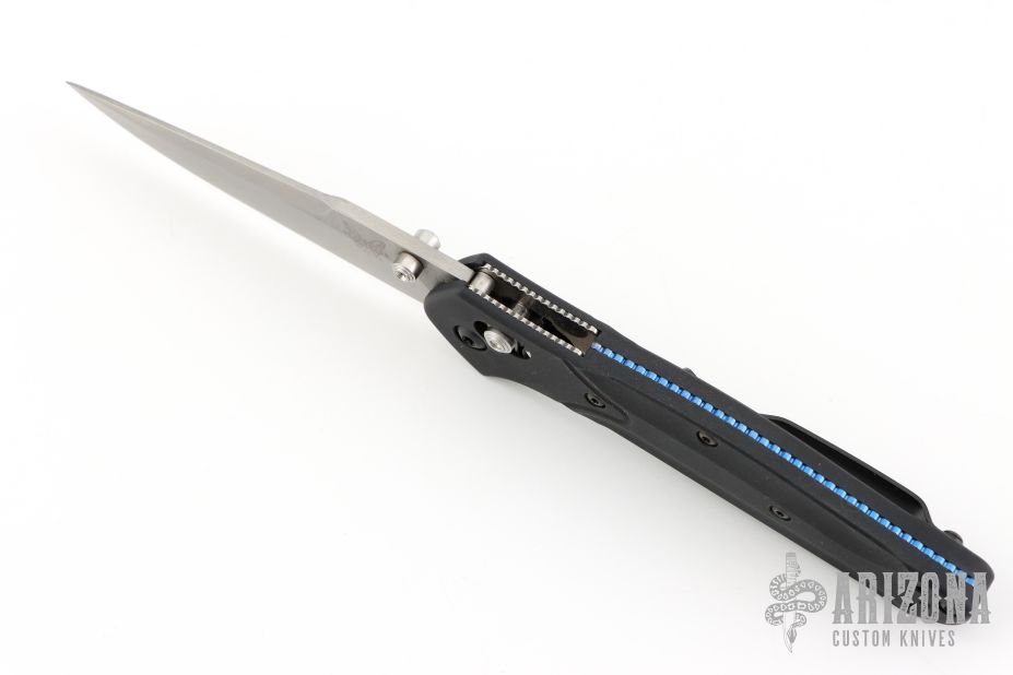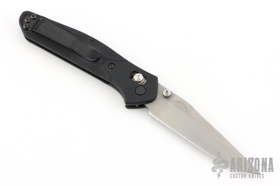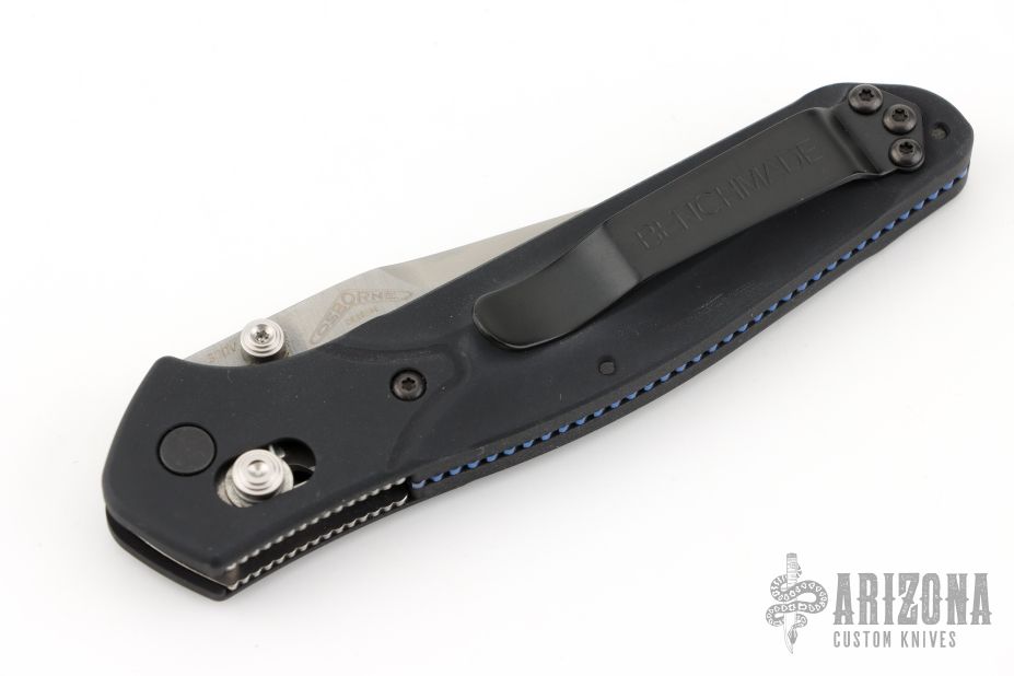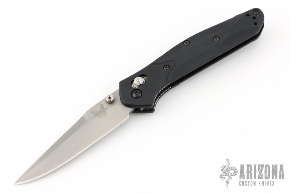 This Osborne designed Benchmade features a stonewashed plain edge blade, black aluminum handle, tip up reversible stainless steel clip. Axis lock mechanism. Comes with original box, papers and drawstring pouch. Has a couple light scuffs, otherwise excellent condition.