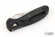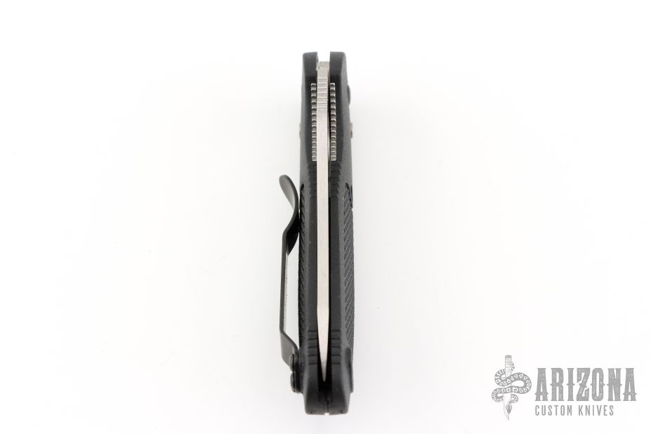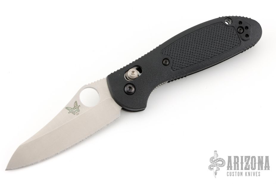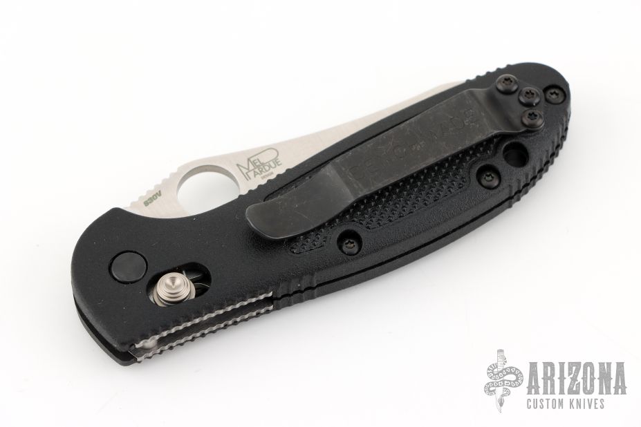 This Mel Pardue design by Benchmade has a hollow ground blade with notched thumbrest and thumbhole. Axis lock mechanism. The handle has black FRN scales, stainless steel liners and tip up reversible clip. Includes original packaging and paperwork. Excellent condition.