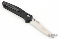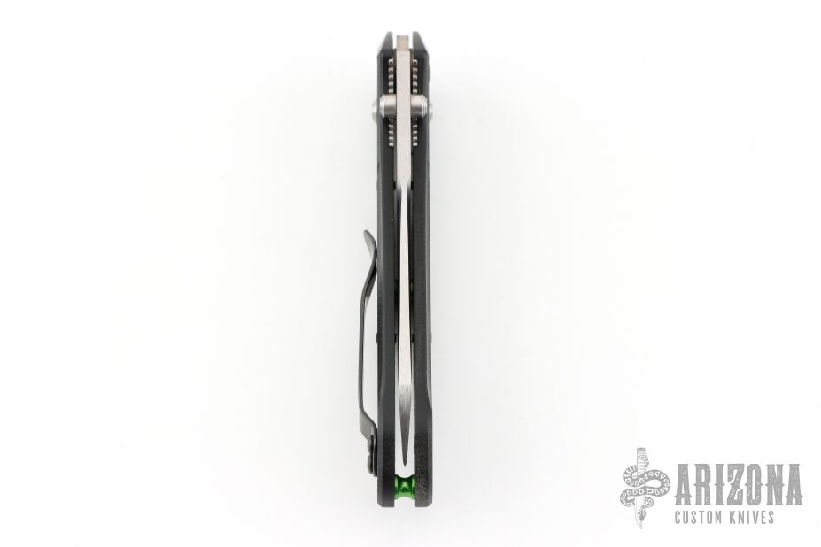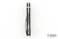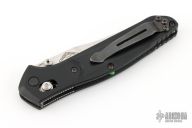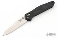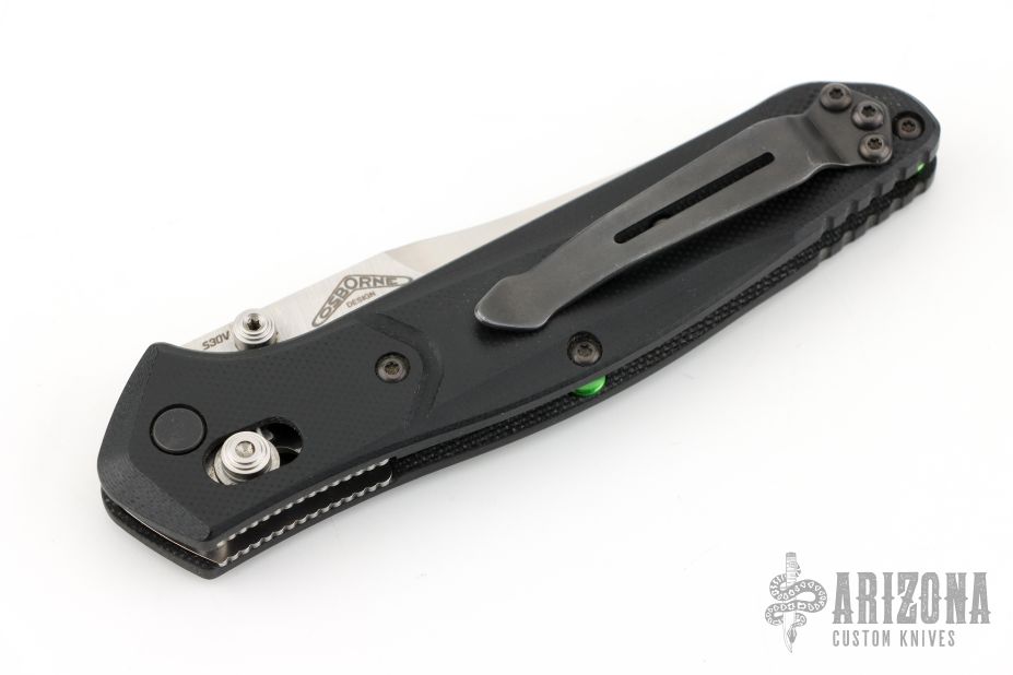 This 940-2 Osborne Axis Lock Folder from Benchmade has a satin S30V clip point blade with false top edge and dual thumbstuds. Handle has black G-10 scales with stainless steel internal liners, anodized aluminum barrel spacers, and black finished stainless steel tip up clip (RH/LH Reversible). Dead center blade seating and excellent lockup. Comes with original box, pouch and papers. Excellent condition. First Production Rrun #623/1000.