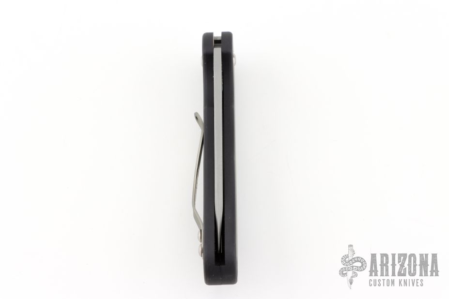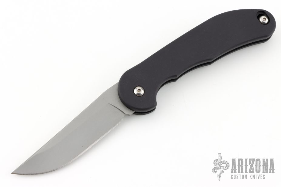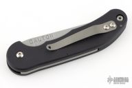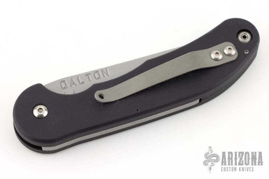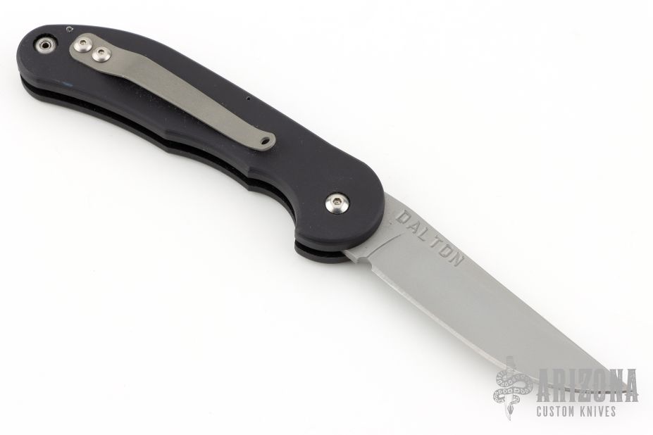 This Smokey scale release automatic by Rob Dalton features a satin finished blade and black aluminum handle. Bead blast stainless steel clip. The blade is deployed by sliding the rear end of the handle scale down. Strong and fast coil-spring opening. Has a couple light scuffs, otherwise excellent condition.