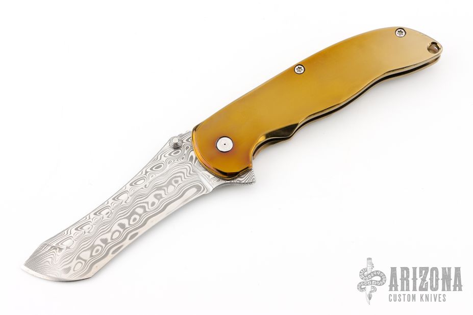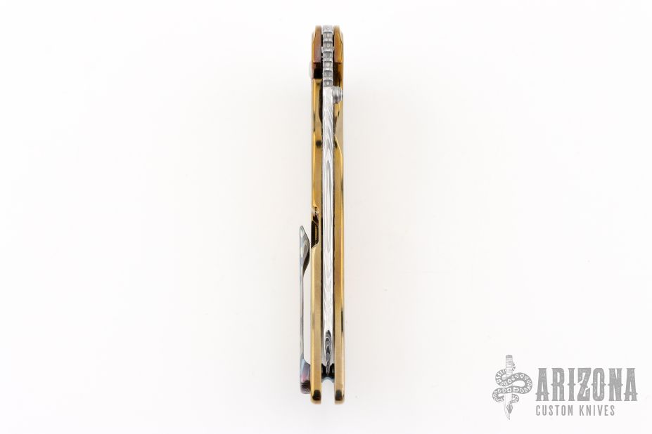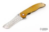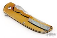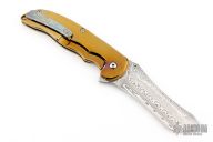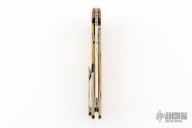 This Norseman (#089) by John Grimsmo features a Damasteel blade with a single titanium thumb stud, notched thumb ramp and flipper. Polished and anodized titanium frame and titanium screws. Matching Damasteel tip up pocket clip.  Very smooth action that requires no wrist movement. Nice detent, lockup and blade seating. Rides on ceramic bearings. Dated March 2013 inside the frame. Comes in a zipper case. Has a couple light scuffs, excellent condition otherwise.