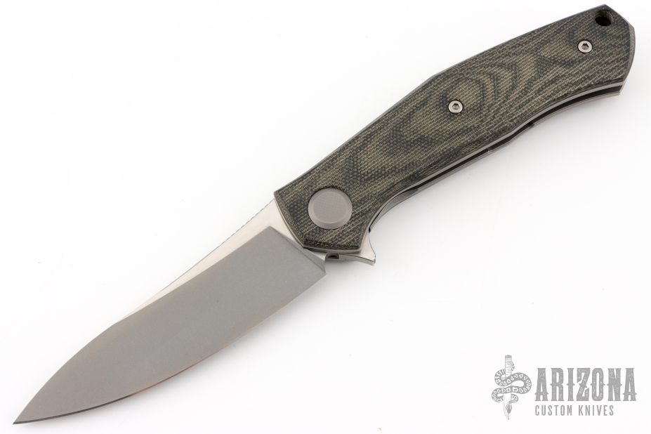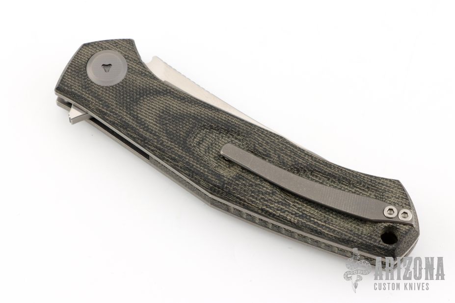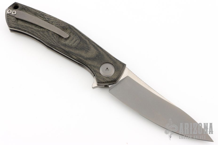 The TNK Cannabis Special Edition (#70 of 100) was designed by Dmitri Sinvevich and has a M390 stonewash flat ground blade with satin flats. The blade fires out fast on a Multi Row Bearing System pivot and has a great lock up with no blade play. The handle is made of blasted and contoured canvas micarta with titanium liners. The backspacer is comprised of matching canvas micarta. The custom carved titanium pocket clip is recessed into the non lock side to provide a flush seating for improved ergonomics. Great blade centering. Designer name, logo and number stamped inside liners. Excellent condition. Includes a zippered case.
