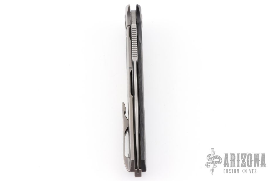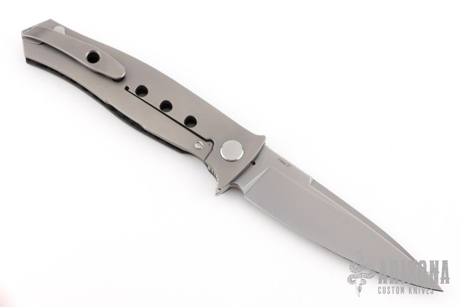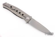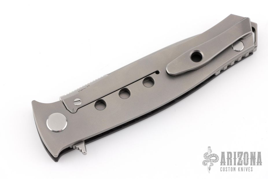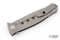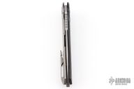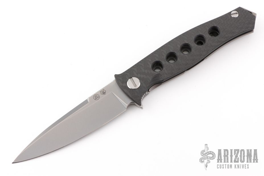 This "Russian Dr. Death" flipper with carbon fiber presentation side scale is a collaboration between Shirogorov and Tom Mayo. This one is #43 of 200 that was made. The blade features a very fine bead blasted/tumbled finish and notched thumbrest and flipper. The handle has a titanium lock side, classic hole pattern, titanium backspacer with lanyard hole and jimping, tip up titanium clip with hole through clip and all the way through the frame, stainless lockbar insert. Has the Mayo and Shirogorov logos near the butt. Nice lockup and blade seating, normal detent. This knife is chalked full of details and is an amazing representation of Tom Mayo's Dr. Death. Comes with original box. Excellent condition.
