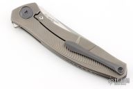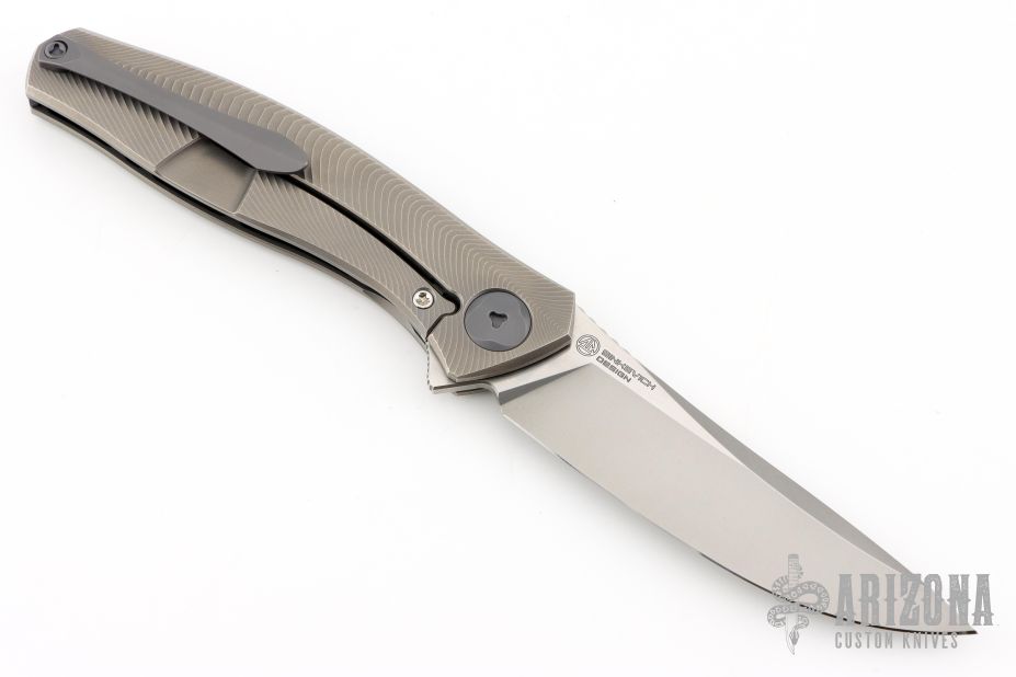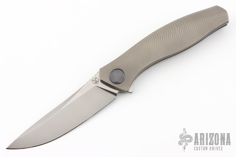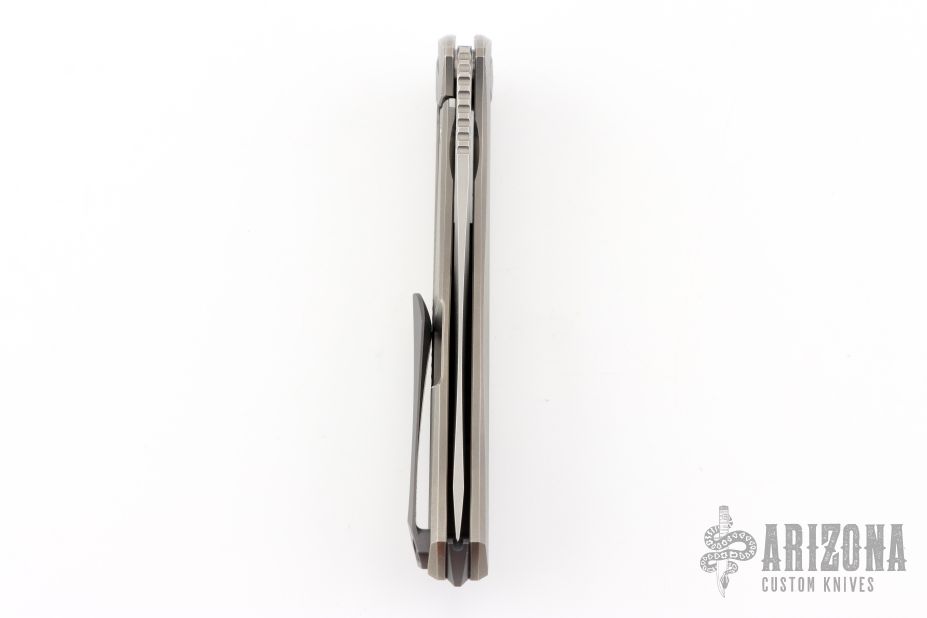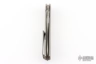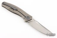 This knife by Shirogorov Knives features a tumbled blade with satin flats and a notched thumb rest and flipper tab.  The handle features a milled titanium frame with a blasted zirconium tip up pocket clip and backspacer.  Blade Steel: M398.  S/N 137/300.  Includes the original box and makers card. Excellent condition.