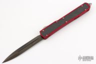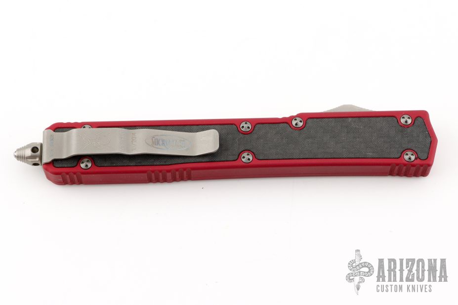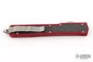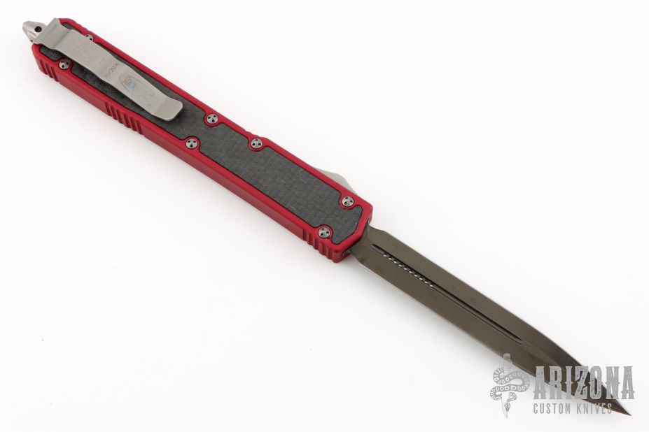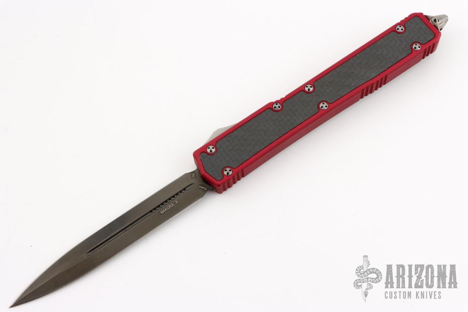 This Makora II OTF automatic by Microtech features a black finish double edge blade with a standard edge, and carbon fiber inserts on both sides of the red aluminum handle. Bead blast stainless steel clip. Glass breaker. Serial number 04308 and dated 10/2014. Comes in a Marfione box, with the label torn off, with unlabeled zipper case and soft pouch.