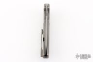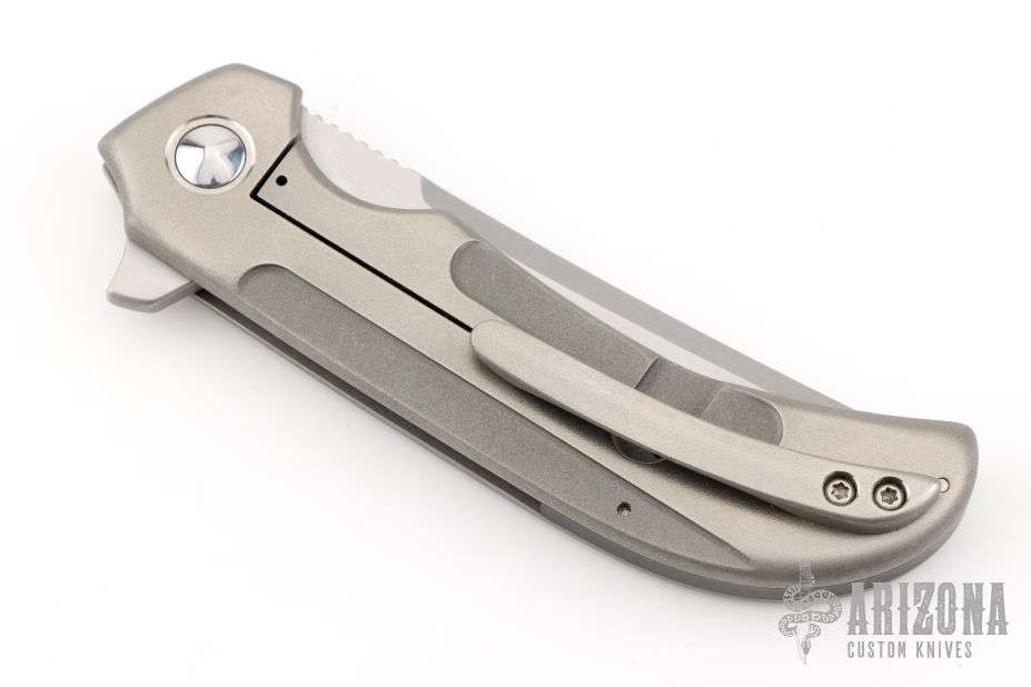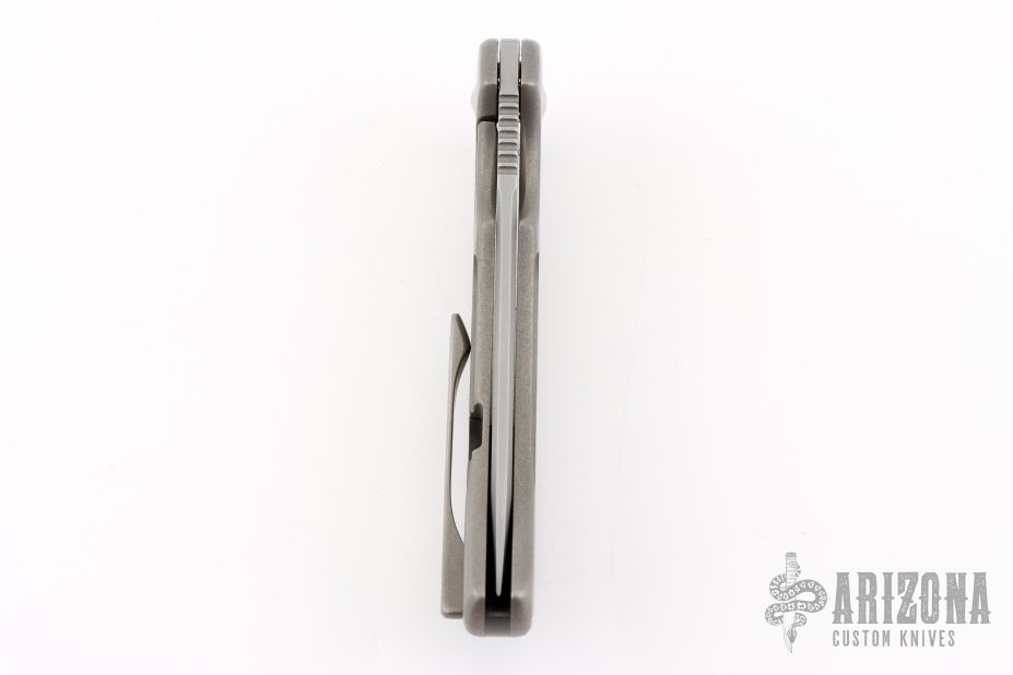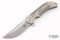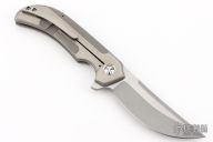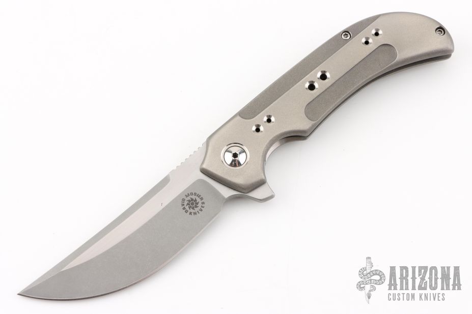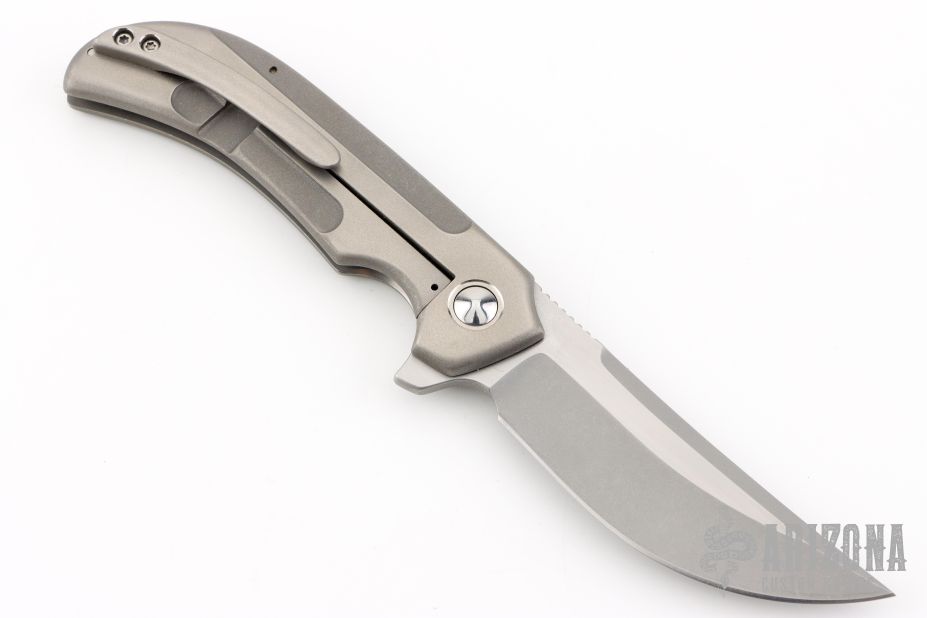 This Serpents Line flipper by David Mosier features an upswept tumbled blade with two-tone finish, notched thumbrest and flipper. The handle has a milled, orange peel finished titanium frame with matching tip up clip and a black carbon fiber backspacer. Nice smooth action, detent, lockup and blade seating. Comes with a hard case. Excellent condition.