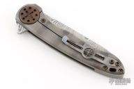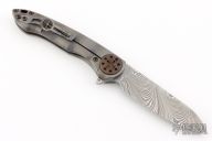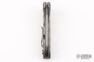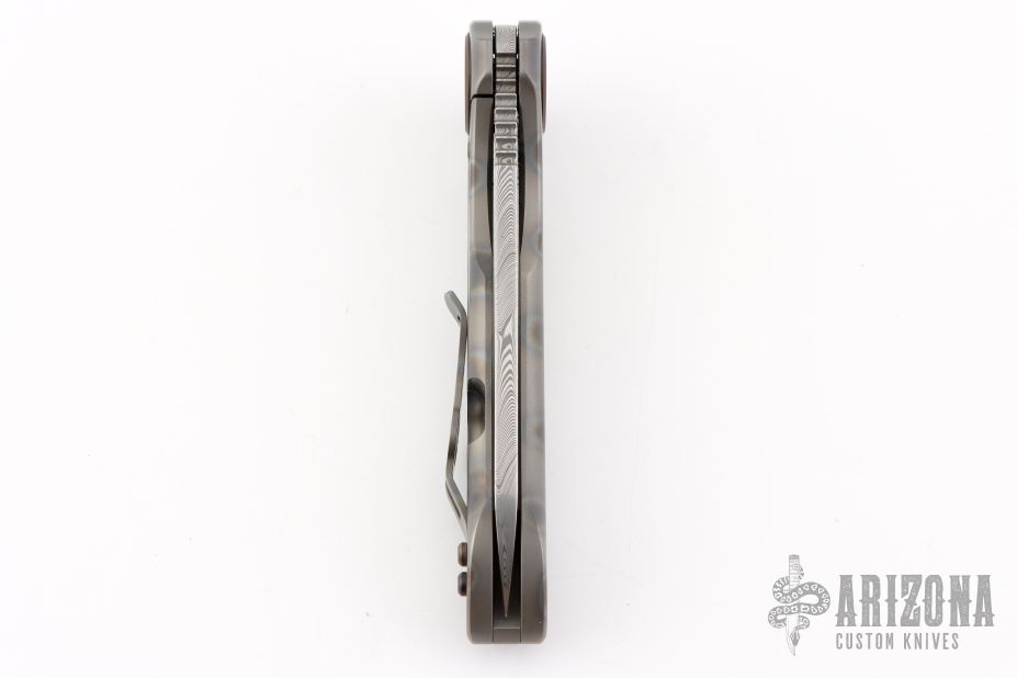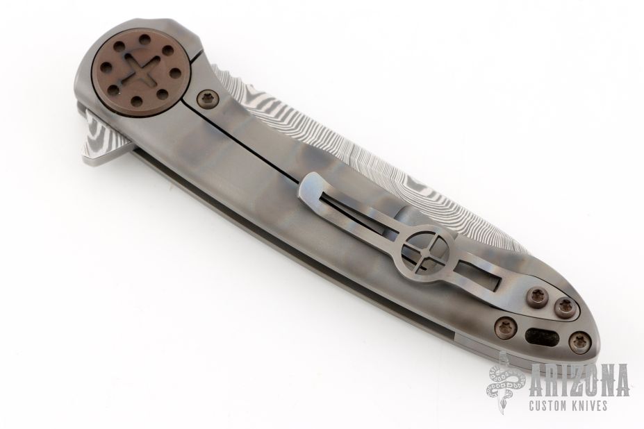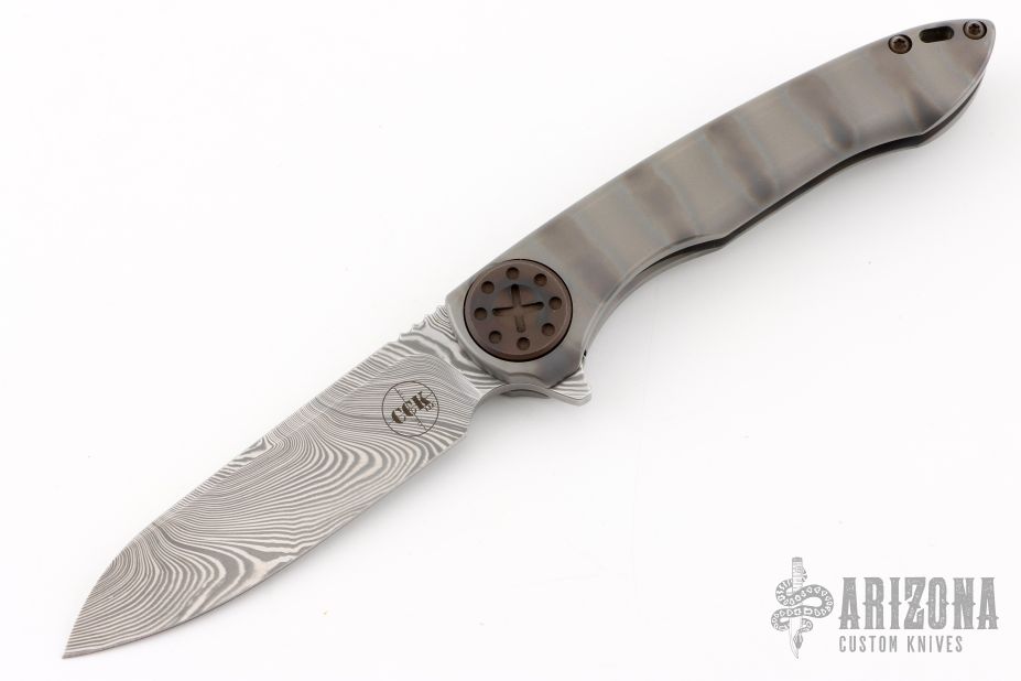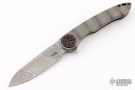 This frame lock flipper by Curtiss Knives features a Damasteel drop point blade with a notched thumbrest and flipper. The handle is composed of an anodized titanium frame complemented by a matching titanium tip up clip. Includes maker's padded zippered case and COA. Has a couple light scuffs, otherwise excellent condition.