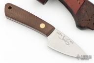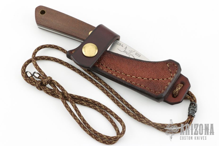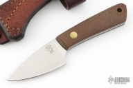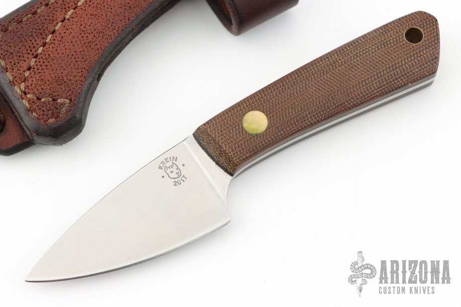 This K-Uti by Tom Krein features a satin finished AEB-L blade with .106" blade stock and 1.171" blade depth, full tang construction. The handle has green canvas micarta scales with black G-10 liners. Comes with Pirtle Made brown leather neck sheath with silver Tiki bead attached. Dated 2011. Excellent condition.