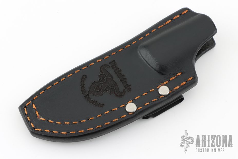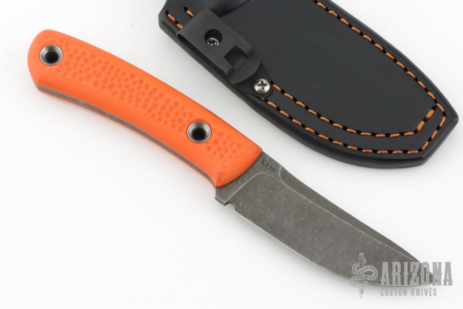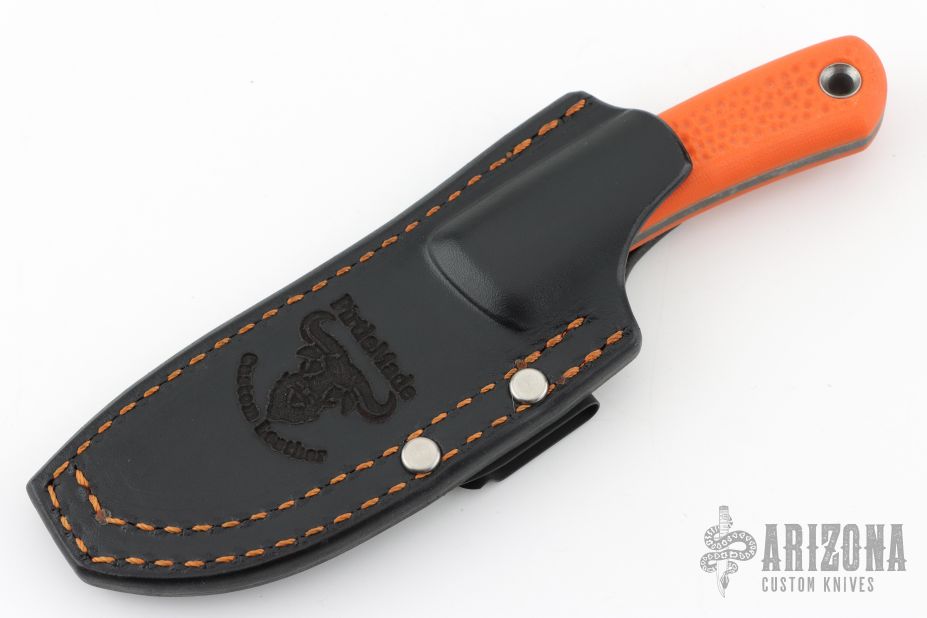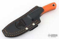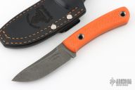 This Skinner by Afonchenko Knives features an acid wash finished blade, .141" blade stock and 1.046" blade depth, full tang construction. The handle has textured orange g10 covers and lanyard hole. Comes with Pirtle Made leather sheath with clip. Has a couple light scuffs, otherwise Excellent condition.