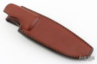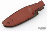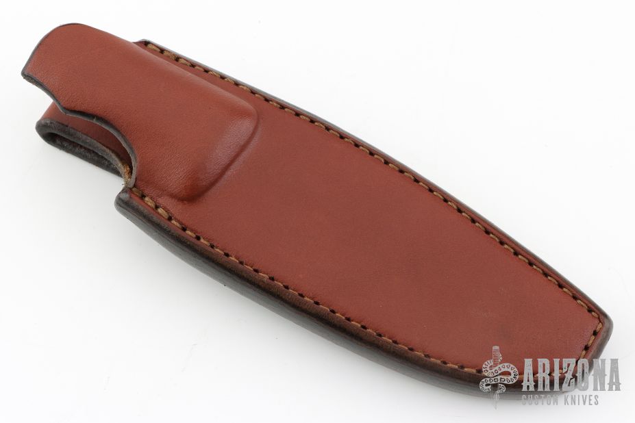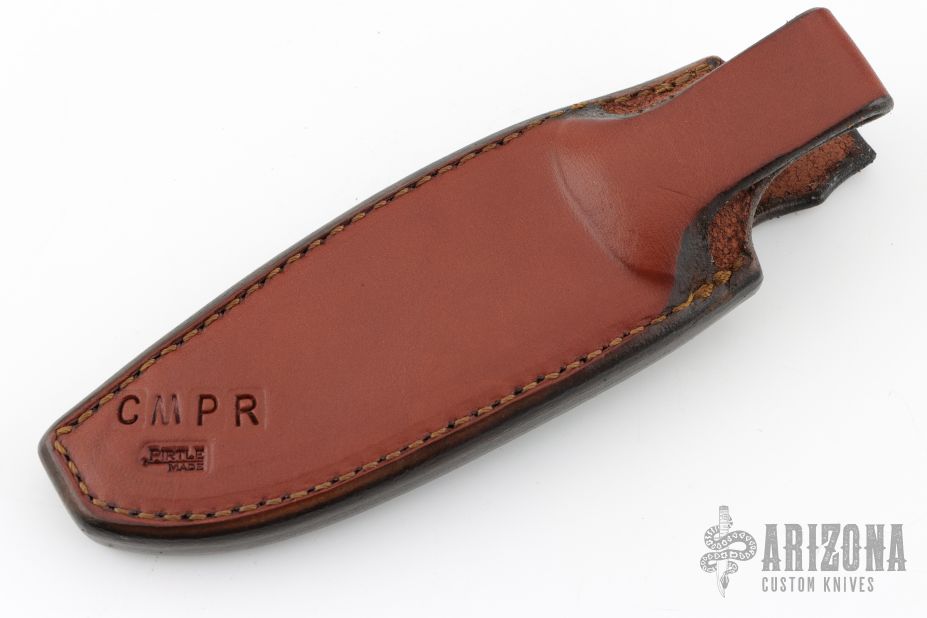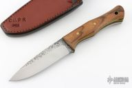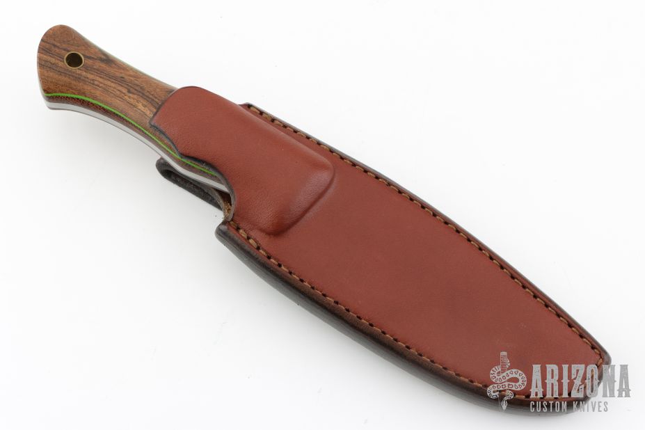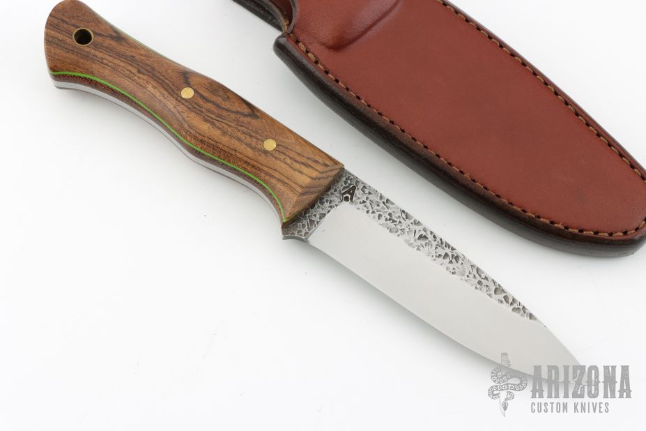 This Camper by AA Forge features a drop point blade with hammer finished flats, satin finished bevels, .179" blade stock and 1.229" blade depth, full tang construction. The handle has wood covers, with green g10 liners, micarta liners, brass pins and lanyard hole. Comes with a Pirtle Made leather sheath. Has a little rusting on the spine otherwise Excellent condition.