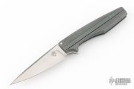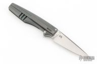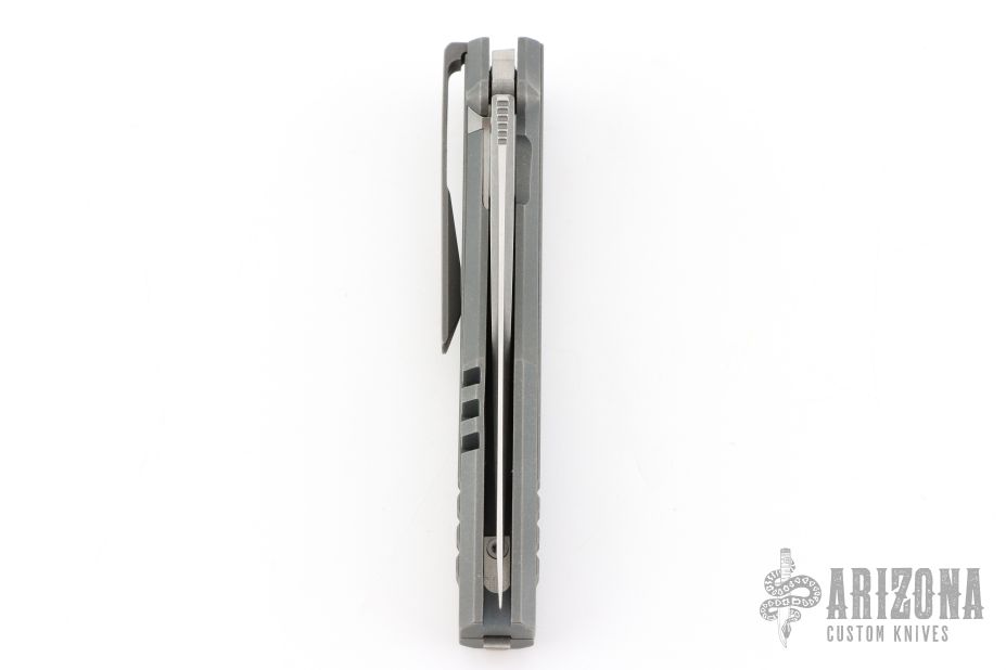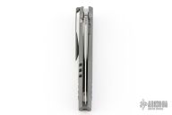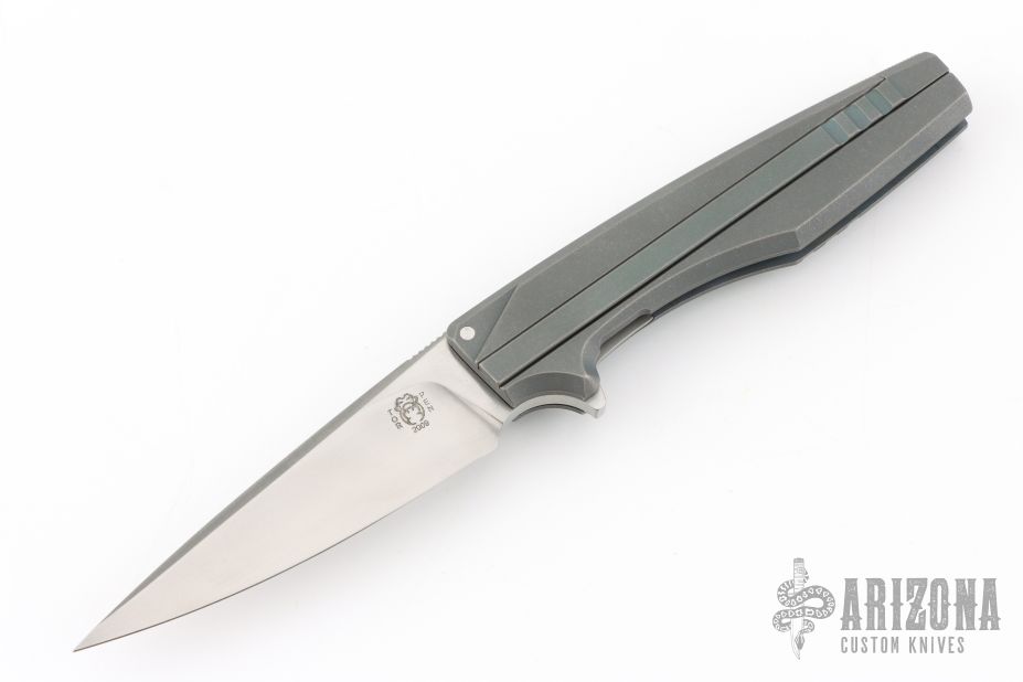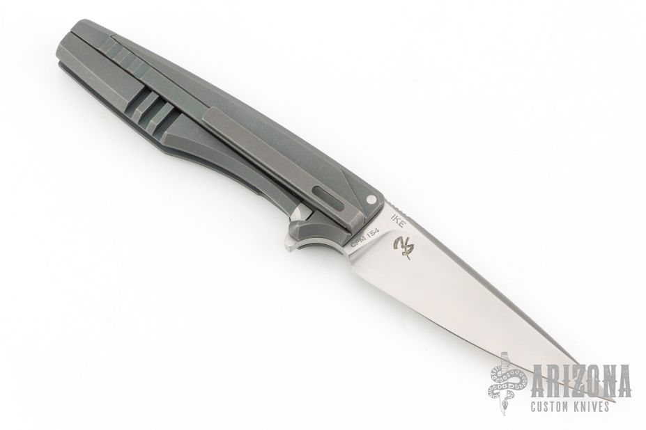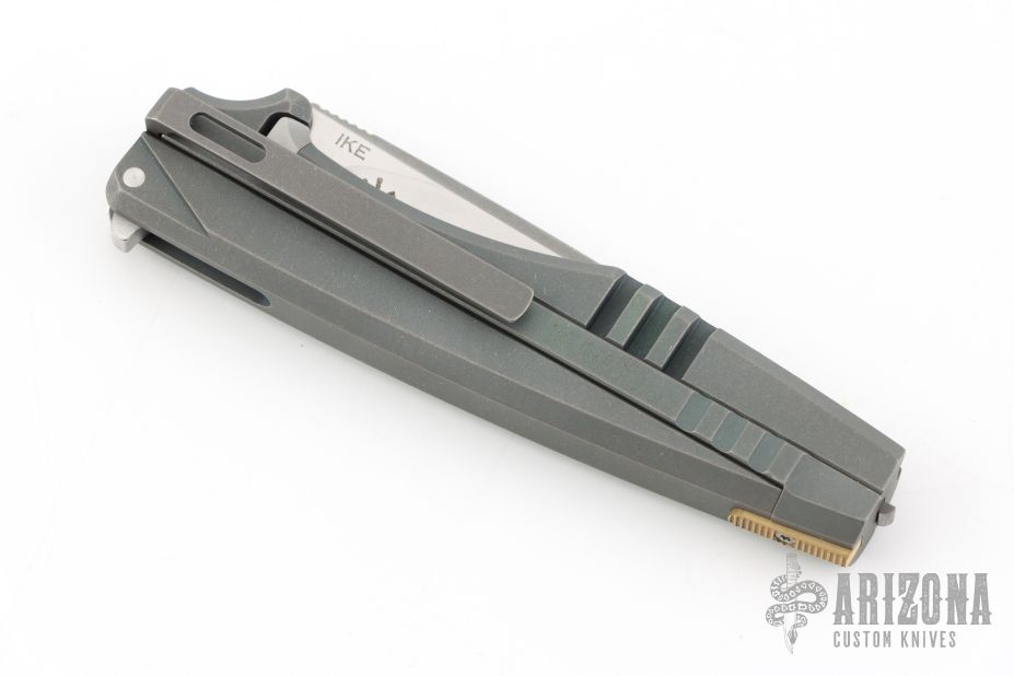 This IKE by Max Knives and Torpen Knives features a satin finished blade with flipper and notched thumbrest. The handle has an integral anodized/stonewashed titanium frame, and tip down titanium clip. Has a stainless lockface insert. Comes with a zippered case and pamphlet. One of 120 pieces made. New from maker!