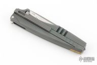 This knife can be dissasembled by pushing down on the tab at the butt and sliding the notched tab on the spine backwards. Then remove the key that sits under the pivot pin. Pull out the clip which is attached to the pivot pin. Then simply pull the blade out by rotating open and pulling out. Put it back together in reverse order.