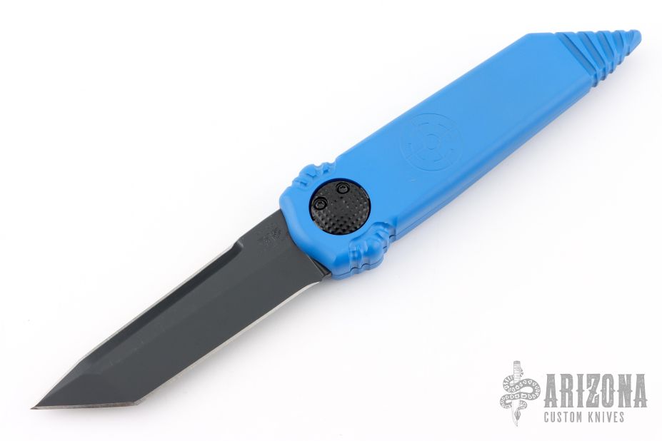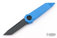 This Dreddlock model sports a blue handle with a bullseye laser etching and a CPM-S30V steel blade with black cerakote finish. The top edge of the knife has been sharpened.