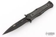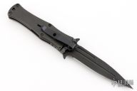 This Madd Maxx 4" Assisted Flipper is a Darrel Ralph Design executed by HTM Knifes. It features a black coated bayonet ground blade with false top edge, fullers, dual thumb studs and flipper. The handle is comprised of a black titanium frame with carbon fiber overlay over barrel spacers. Black coated steel tip down clip and lanyard hole in pommel. Includes padded and zippered case, original box and papers. Excellent condition.