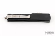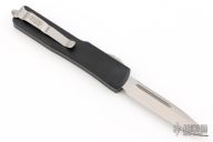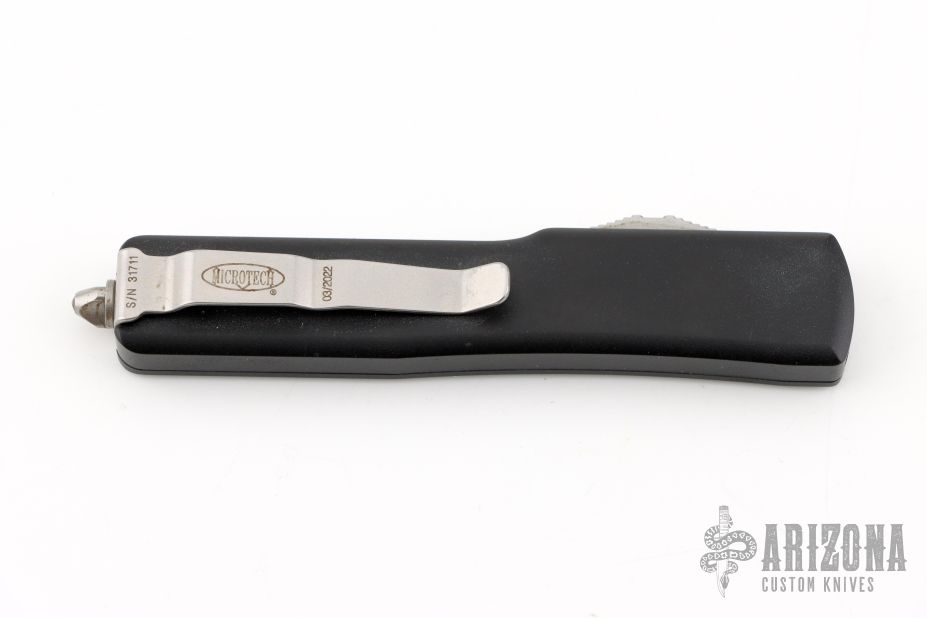 This UTX-70 OTF automatic features a stonewashed blade with a standard edge. Has a black aluminum frame with a blasted tip down pocket clip and glass breaker. Comes with original box and papers. Has some light scuffs, otherwise excellent condition. #31711 and dated 03/2022.