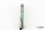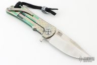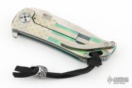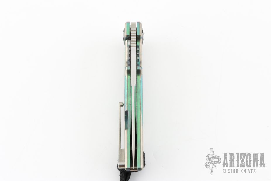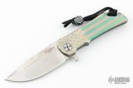This knife features a two-tone blade with mirror polished grinds. The handle features a titanium frame with a matching tip up pocket clip. Includes the original padded case. Nice detent, lock up and blade seating. Excellent Condition.