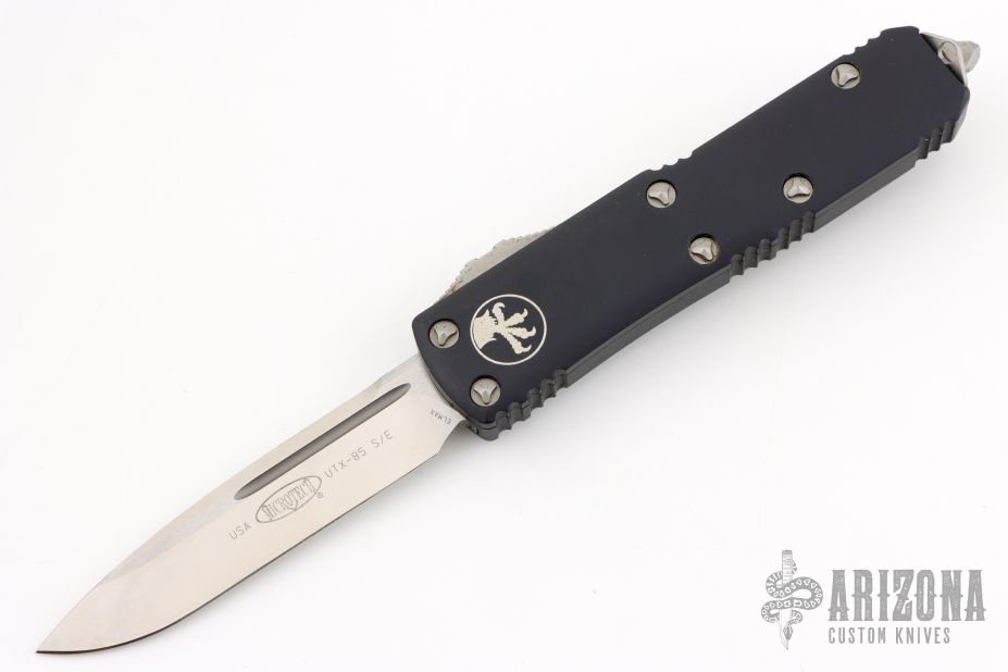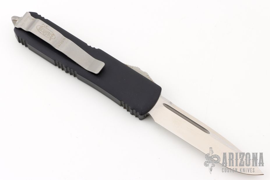This UTX-85 by Microtech features a satin finished. The handle has a black aluminum frame with blasted hardware and tip down clip. Comes with original box and papers. Dated 09/2016 and S/N 02978.  Includes the original box and papers. Has a couple light scuffs otherwise Excellent Condition.