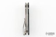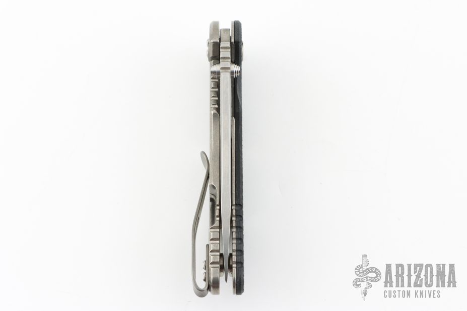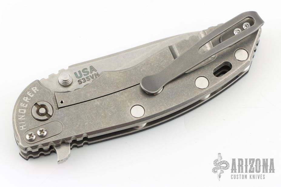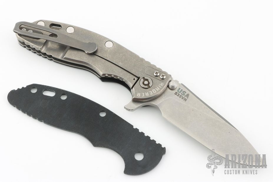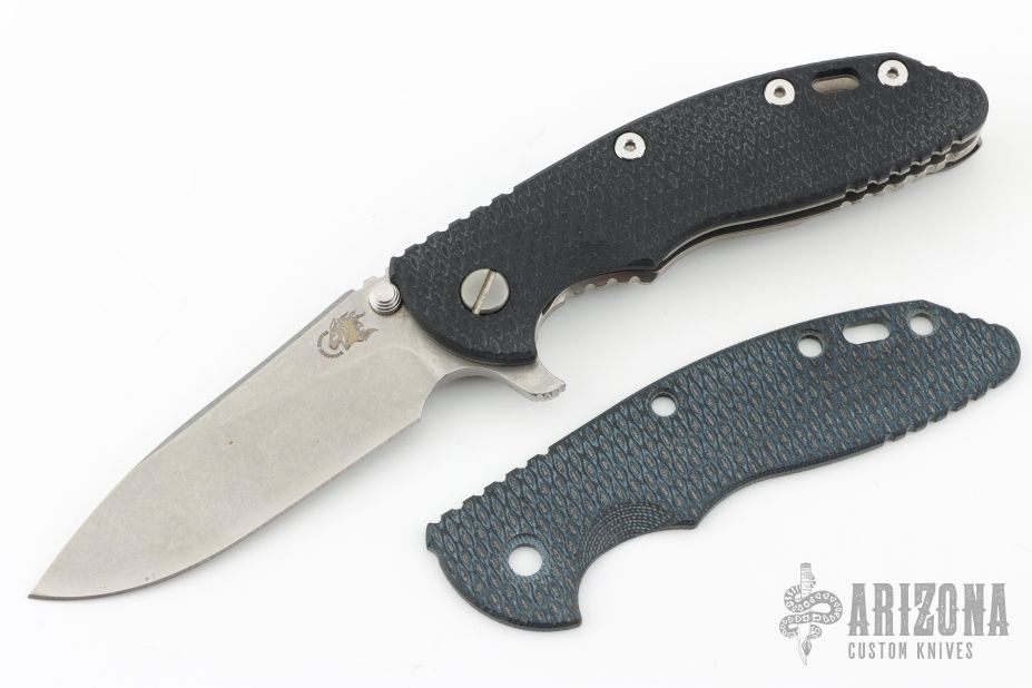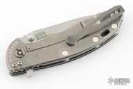 This XM-18 by Rick Hinderer features a stonewash finished blade with notched thumbrest and flipper. The handle has a stonewashed titanium frame with black G-10 scale, and a tip up or down reversible titanium clip, pivot, and filler tab, lanyard hole at the butt. Comes with an extra scale and deep carry clip attached. Does not have the original clip. Has a couple light scuffs, excellent condition otherwise.