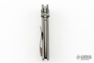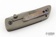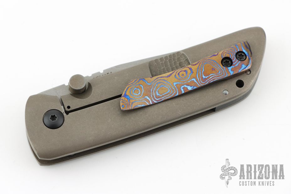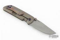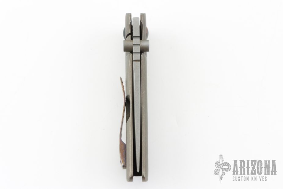 This Tanjun by Jonathan McNees features a clip point blade with notched thumbrest and dual thumbstuds. The handle has an acid wash and tumble finished titanium frame with a polished pivot, carbon fiber backspacer and Timascus tip up clip. Nice detent, blade seating and lockup. Comes with maker's velcro case. Excellent condition.