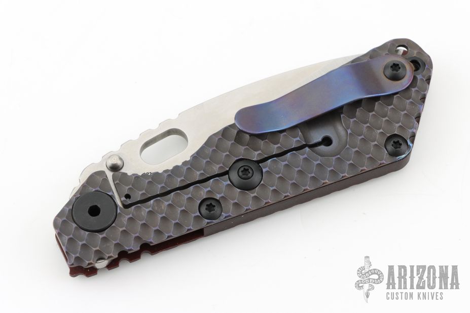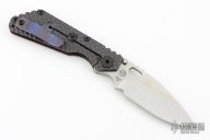 This SNG DGG by M Strider has a satin/stonewashed Bowie blade with dual thumb studs, thumbhole, and notched thumbrest. Handle is black G-10 and antiqued anodized titanium "Gunner Grip", lockbar stabilizer, and titanium tip up clip. Nice detent, lockup and blade seating. Excellent Condition.