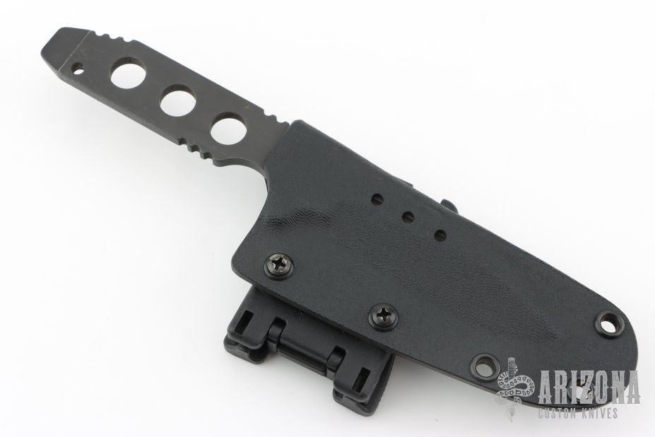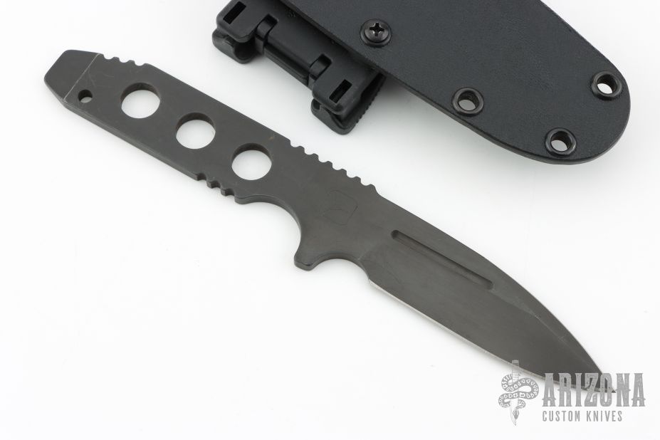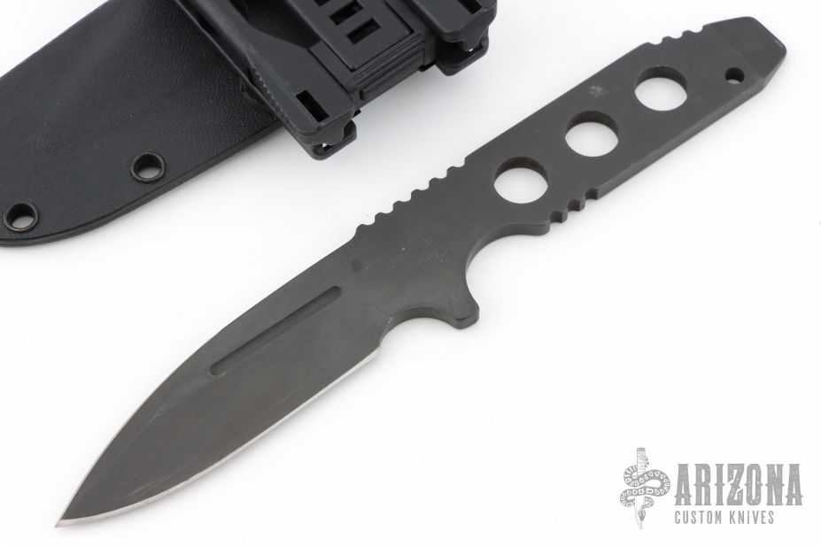 This TAD edition Fixed Blade by Strider Knives features a bead blast blade with nearly sharpened top edge and notched thumbrest, .190" blade stock and 1.03" blade depth, full skeletonized construction. Comes with a kydex sheath. Has scuffs and scratches throughout. Good condition; great user condition.