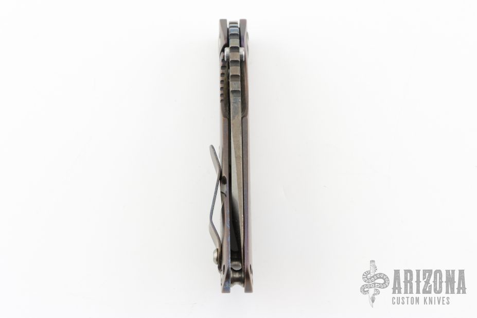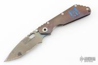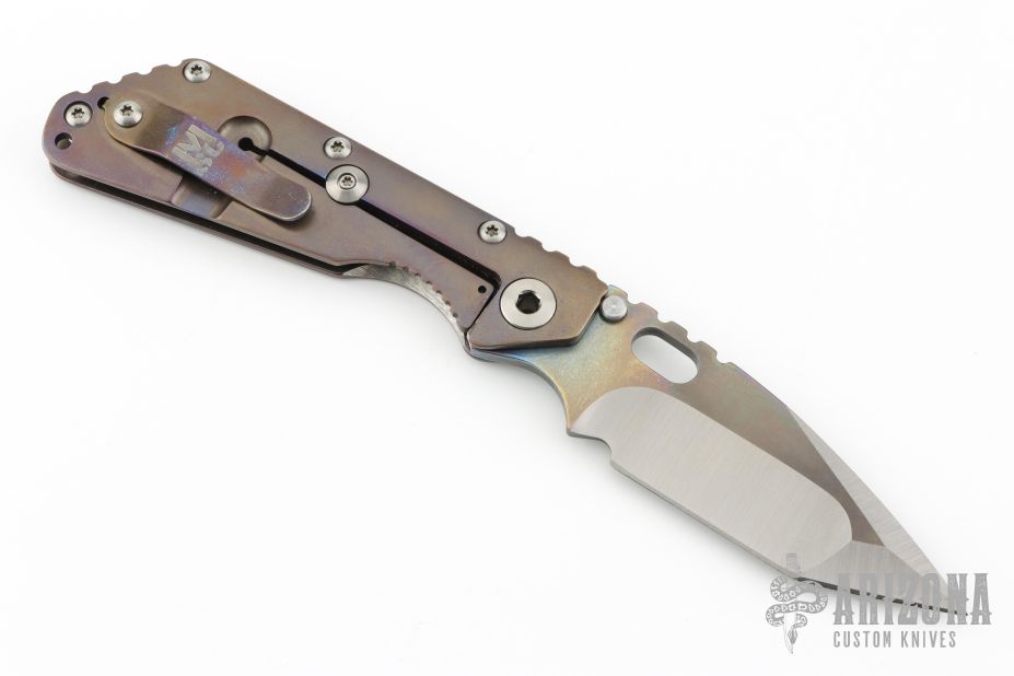 This Mick Strider custom SMF framelock folder features a chisel ground tanto Strike Plate Titanium blade with notched thumbrest and thumbhole. The handle has an anodized and orange peel finished titanium frame with laser etching and a matching clip. Includes Hinderer "Lock Bar Stabilizer" for maximum reverse lock retention. Nice lockup, blade seating and detent. Excellent Condition.