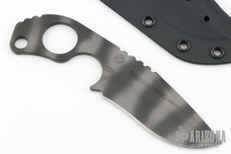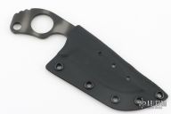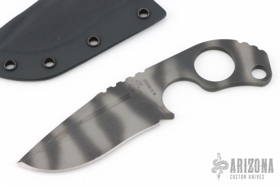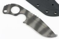 This SLCC by Mick Strider features a tiger striped tanto blade with a notched thumbrest. 0.166" blade stock and 1.505" blade depth. The handle has a finger groove and ring. Comes with a kydex sheath. Has some scuffs and scratches, otherwise great condition.