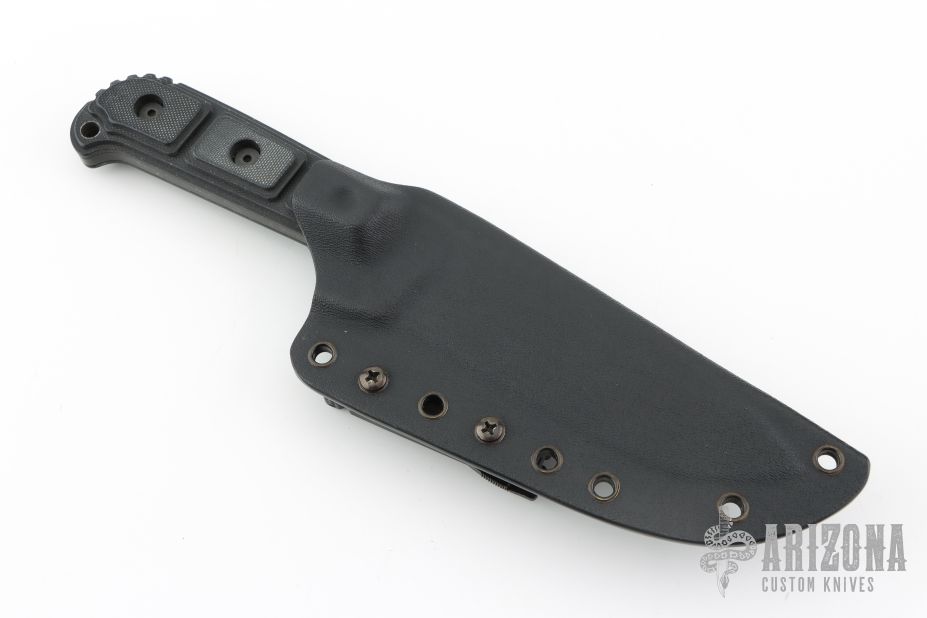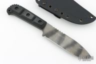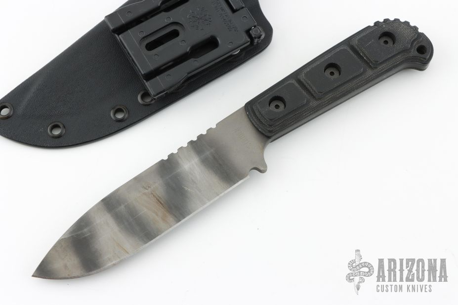 This MSS by Strider Knives features a tiger striped drop point blade with a notched thumbrest, .190" blade stock and 1.395" blade depth, full tang construction. The handle has black G-10 scales. Comes with a nylon tactical sheath. Has scuffs and scratches throughout. Fair condition; Good user condition otherwise.